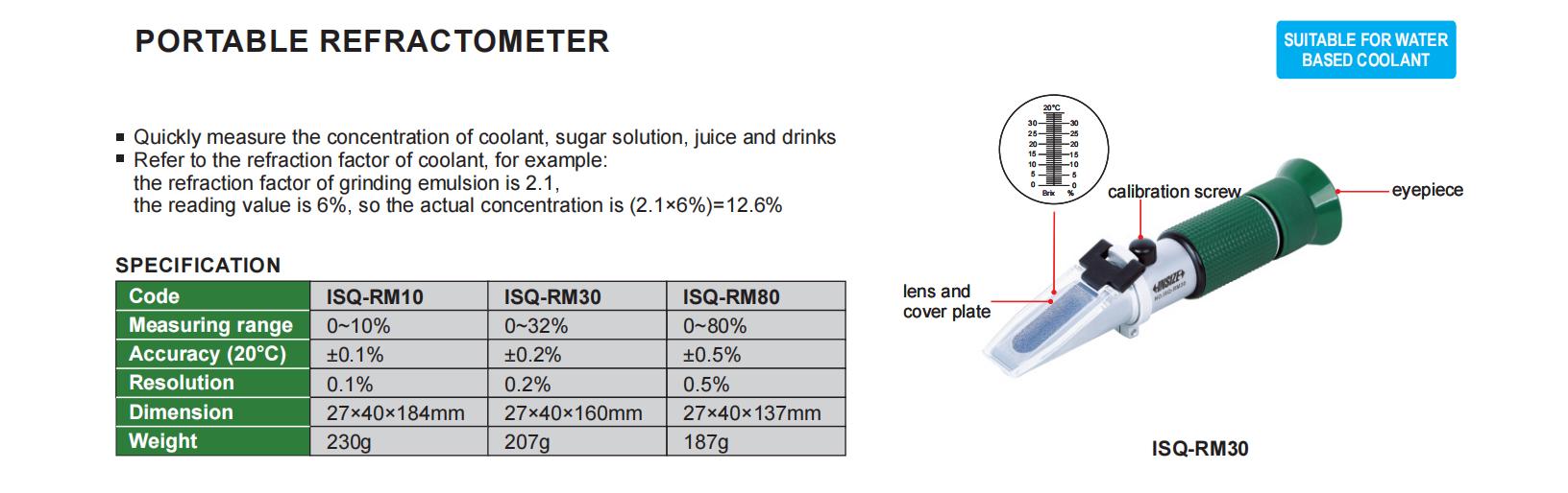 | ISQ-RM30 | Refractometer | Off-line | Water based coolant, sugar, juice | Scale |