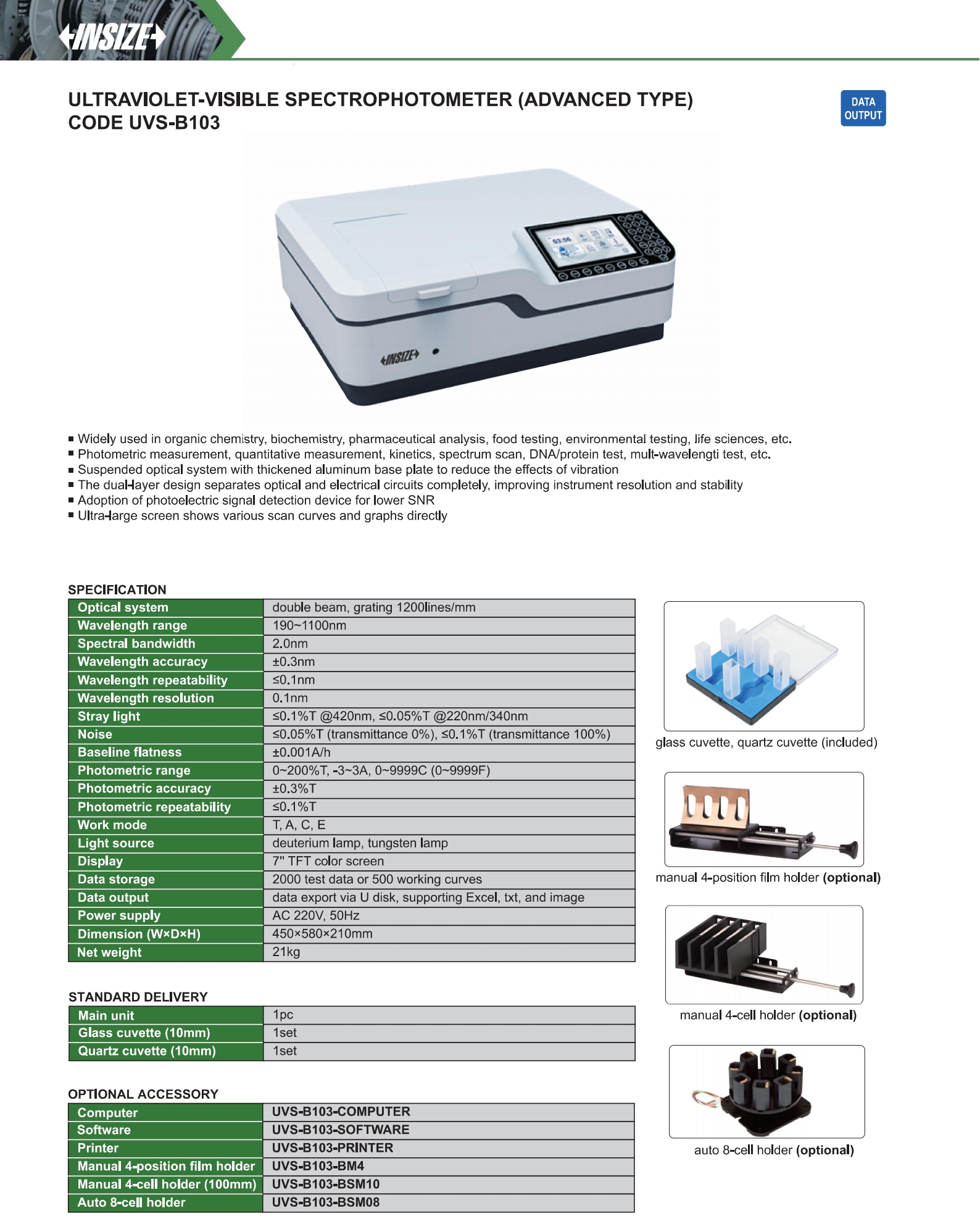 | UVS-B103 | Absorbance | 190~1100nm | ±0.3nm | ±0.3%T |
