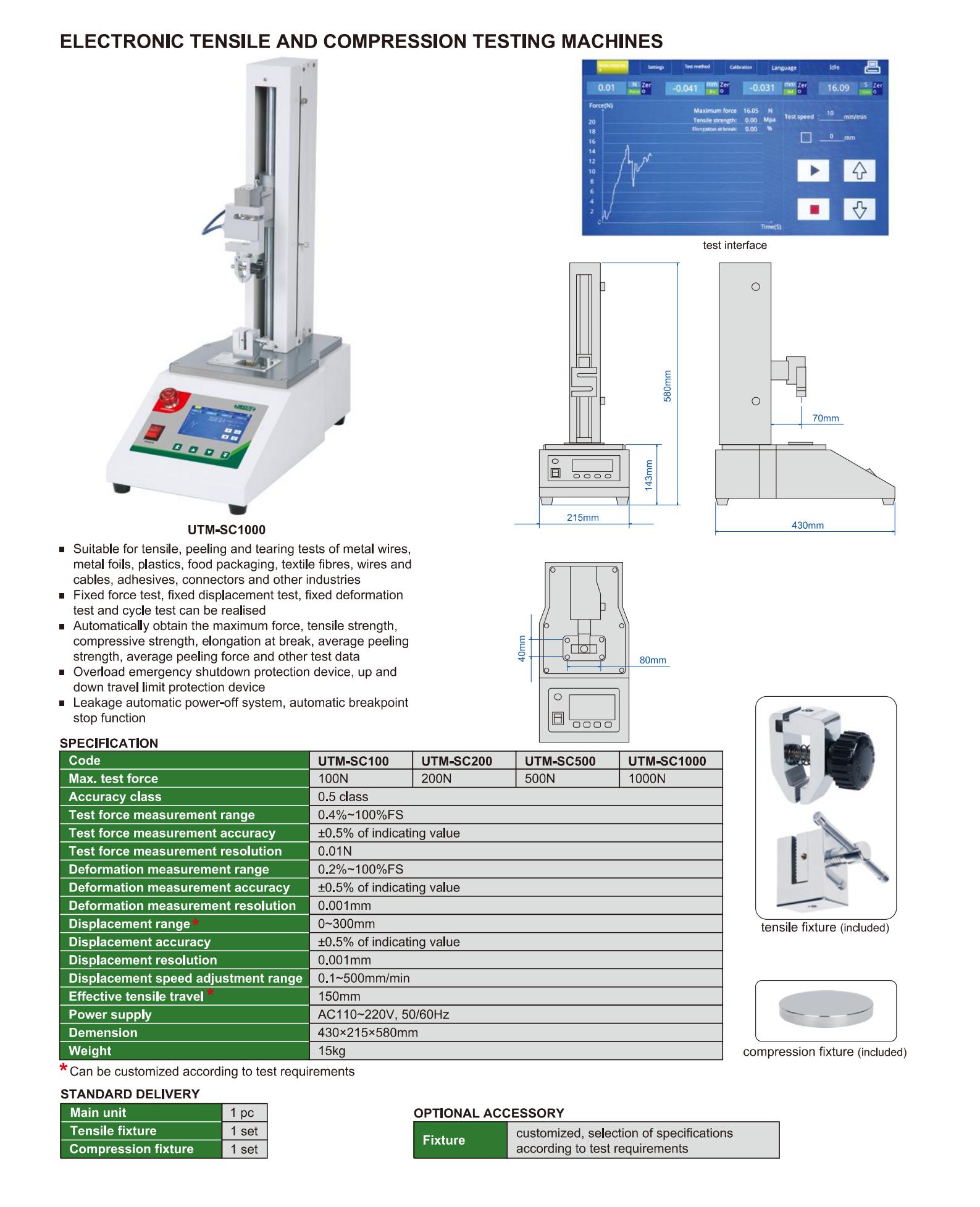 Suitable for tensile, peeling and tearing tests of metal wires, metal foils, plastics, food packaging, textile fibres, wires and cables, adhesives, connectors and other industries