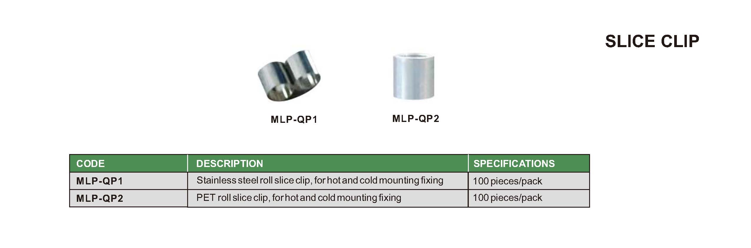 | MLP-QP1 | stainless steel roll slice clip, for hot and cold mounting fixing | 100 pieces/pack | mounting |