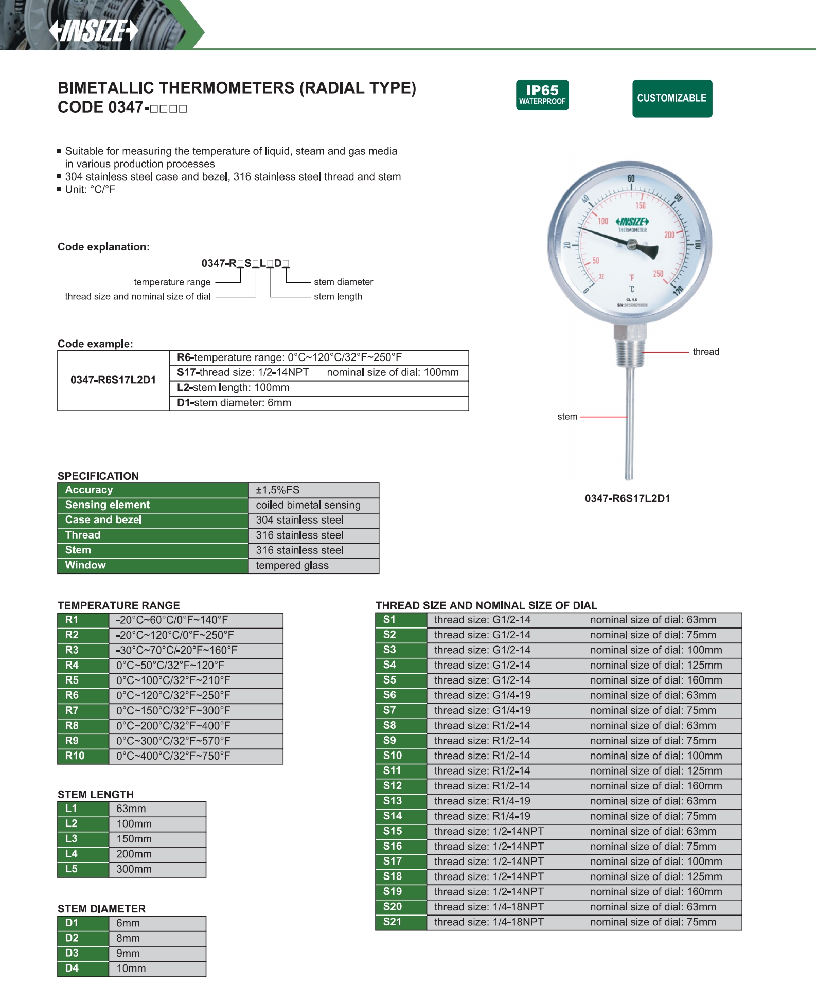 304 stainless steel case and bezel, 316 stainless steel thread and stem