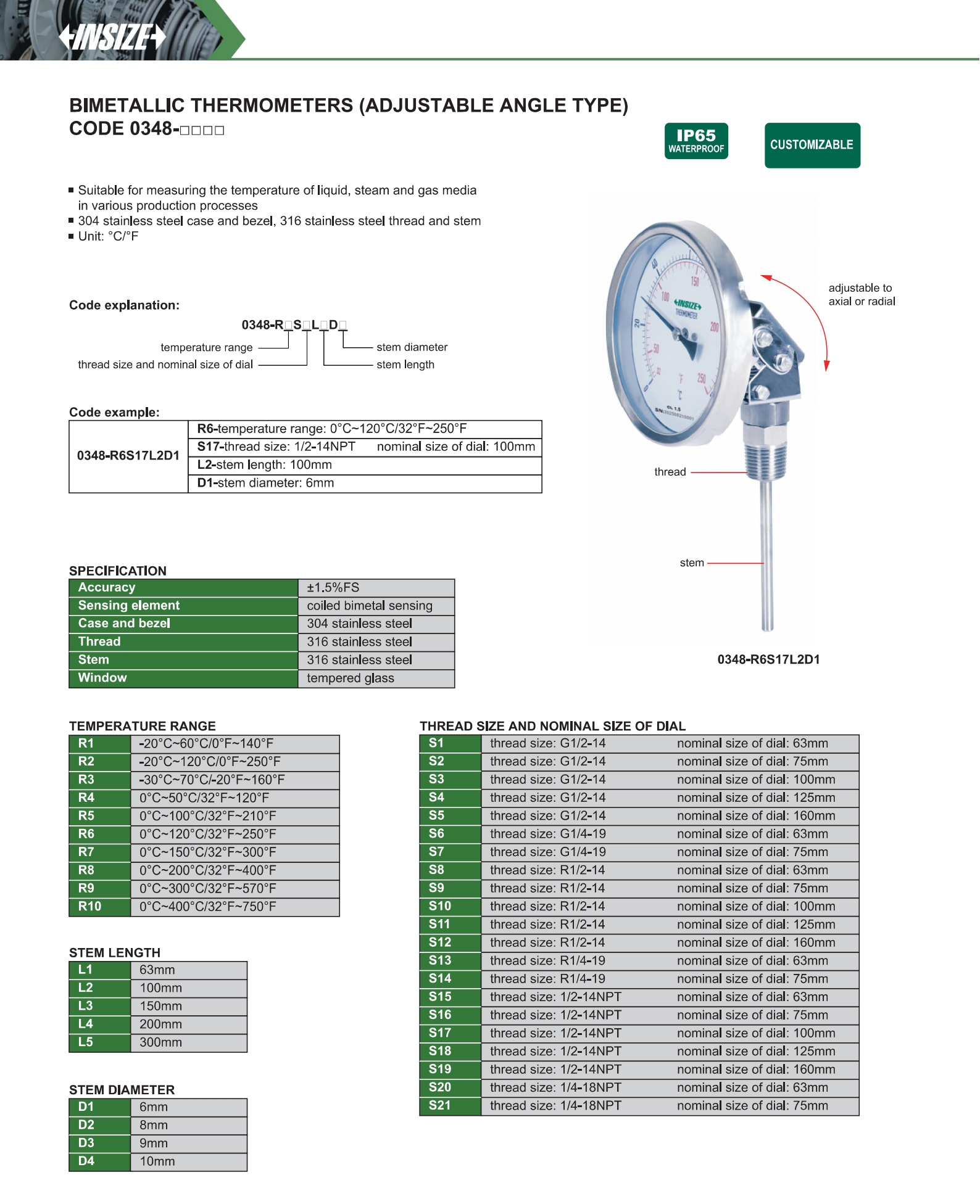 304 stainless steel case and bezel, 316 stainless steel thread and stem