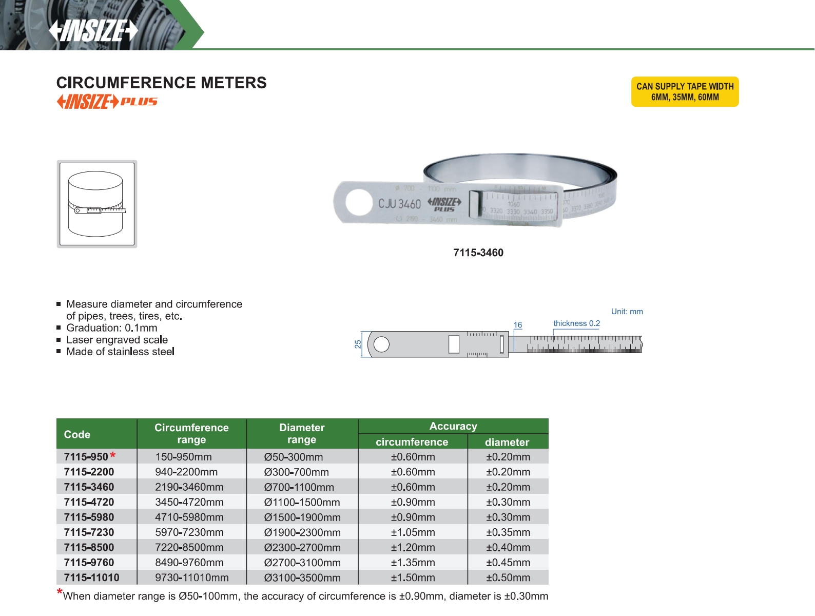 | Code | Graduation | Diameter range | Circumference range | Circumference accuracy | Diameter accuracy |