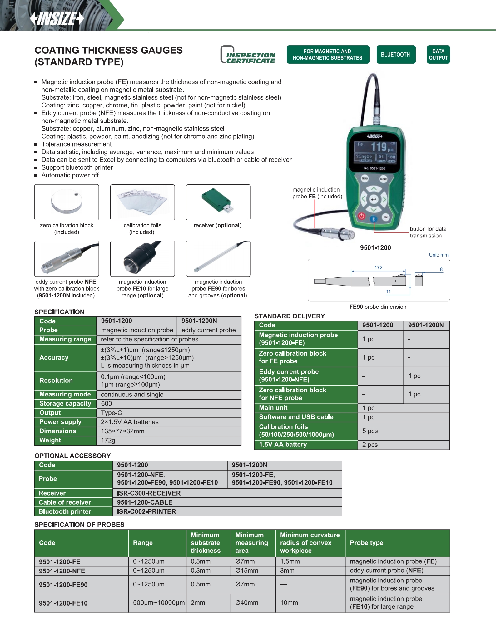 | 9501-1200N | 0~1250μm | ±(3%L+1)μm (range≤1250μm), ±(3%L+10)μm (range>1250μm) | 0.1μm (range<100μm), 1μm (range≥100μm) | Type-C |