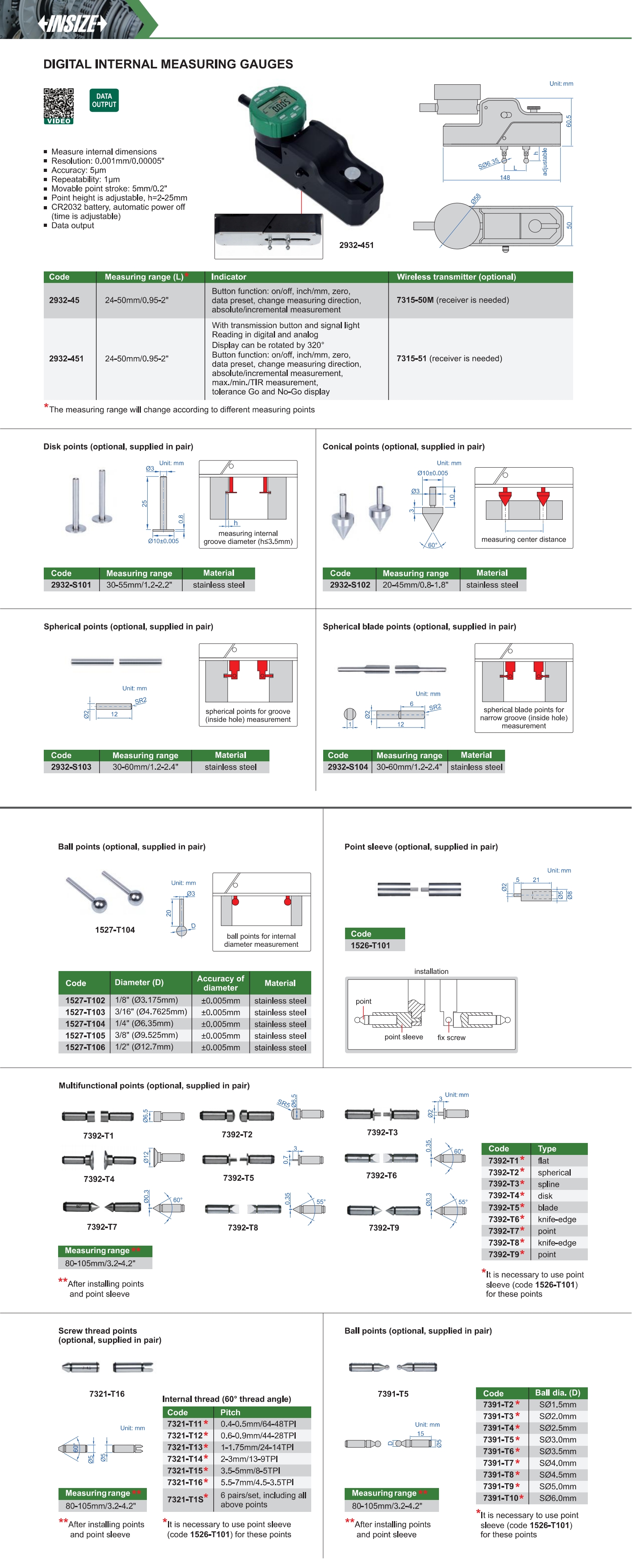 | 2932-451 | 5µm | 0.001mm/0.00005" | 1µm | 24-50mm/0.95-2" |