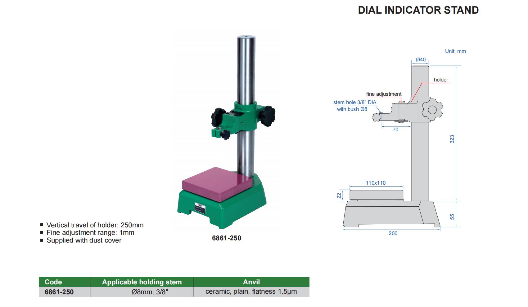 Vertical travel of holder: 250mm