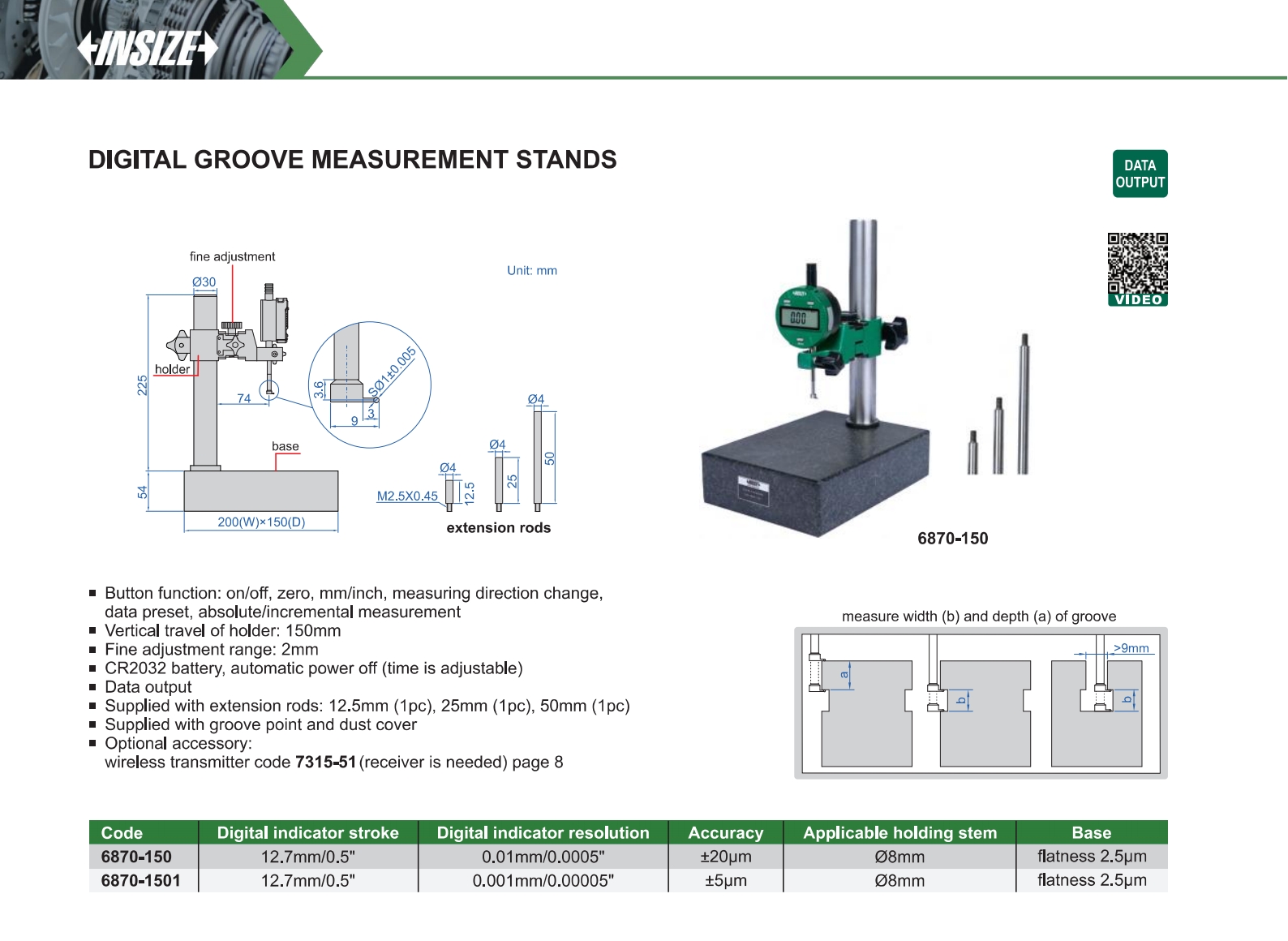 Button function: on/off, zero, mm/inch, measuring direction change, data preset, absolute/incremental measurement