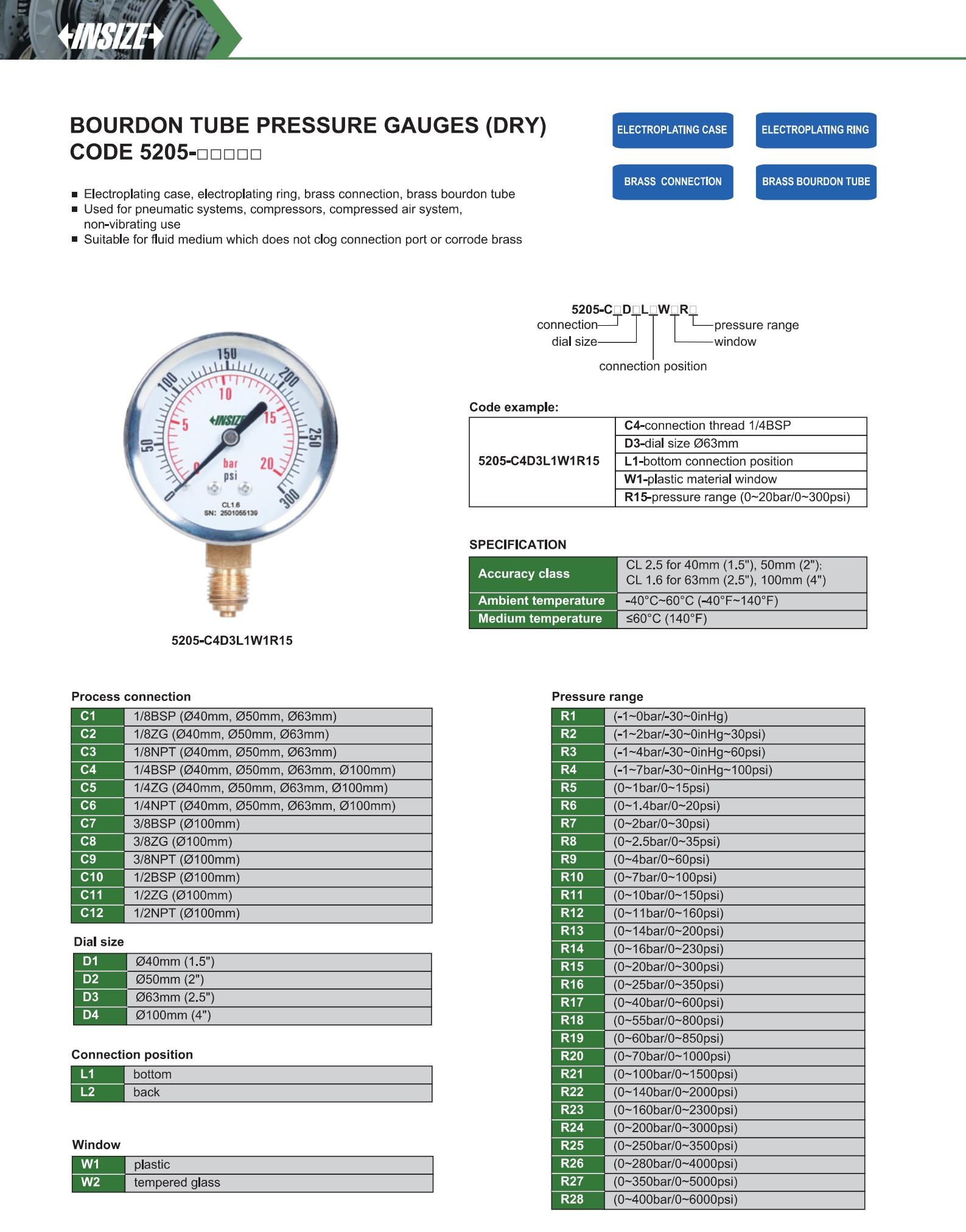 | 5205 | 1/8BSP, 1/8ZG, 1/8NPT, 1/4BSP, 1/4ZG, 1/4NPT, 3/8BSP, 3/8ZG, 3/8NPT, 1/2BSP, 1/2ZG, 1/2NPT | Ø40mm, Ø50mm, Ø63mm, Ø100mm | bottom, back | plastic, tempered glass |