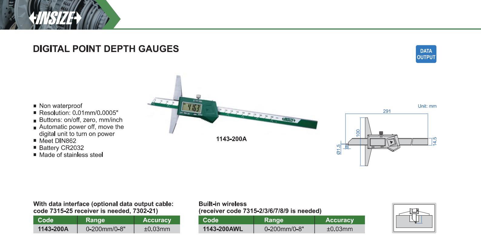 | 1143-200A | 0-200mm/0-8" | ±0.03mm | 0.01mm/0.0005" | with data interface |