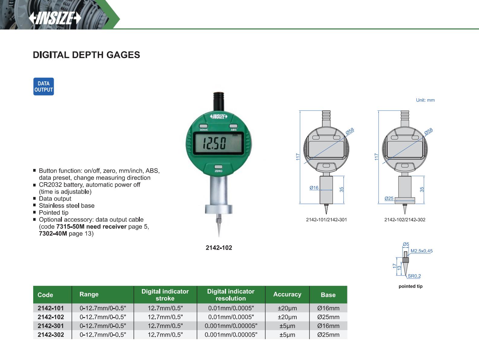 | 2142-102 | 0-12.7mm/0-0.5" | ±20µm | 0.01mm/0.0005" | with data interface |