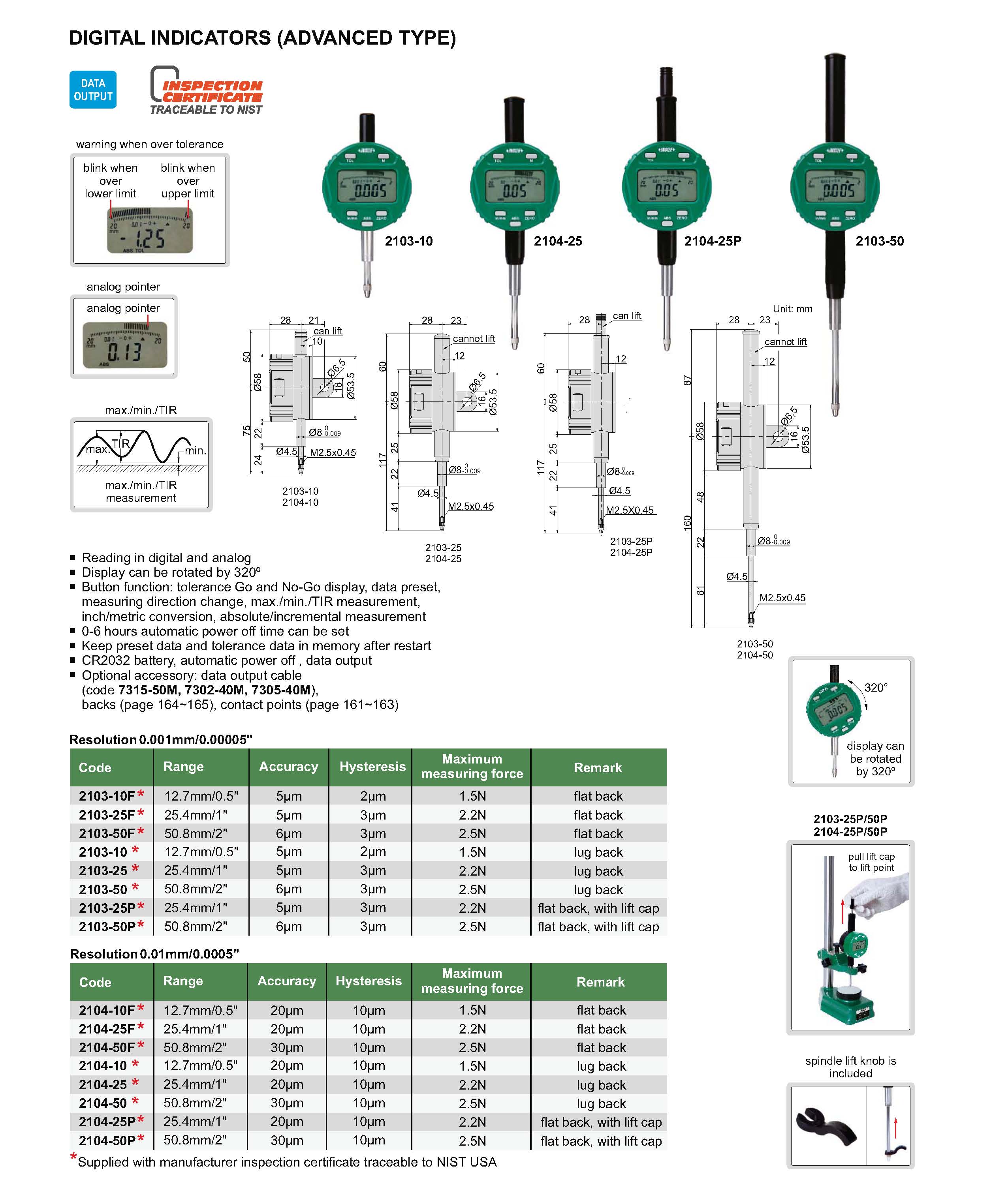 | 2103-10 | 12.7mm/0.5" | 5µm | 0.001mm/0.00005" |