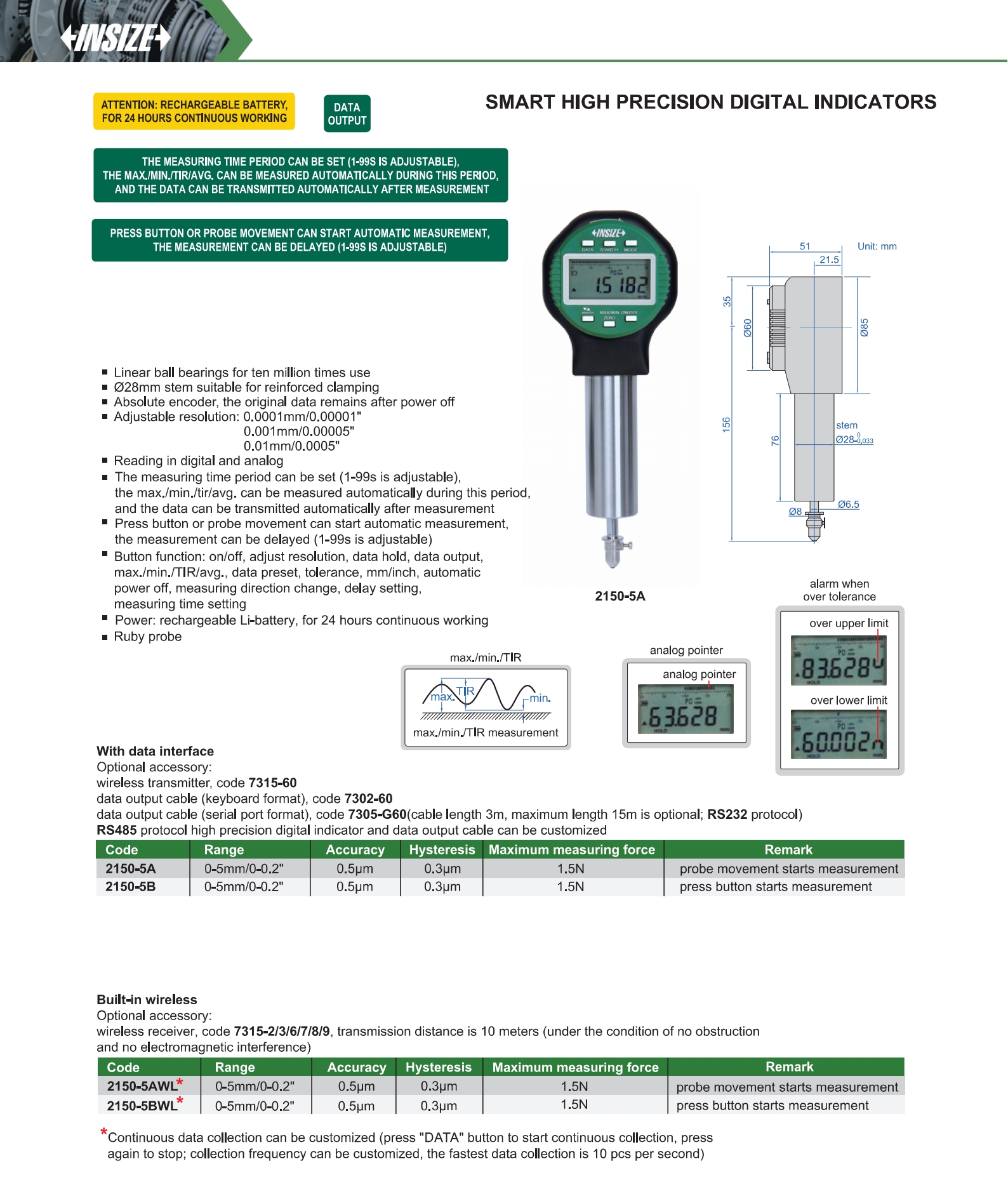| 2150-5AWL | 0-5mm/0-0.2" | 0.5µm | 0.0001mm/0.00001" |