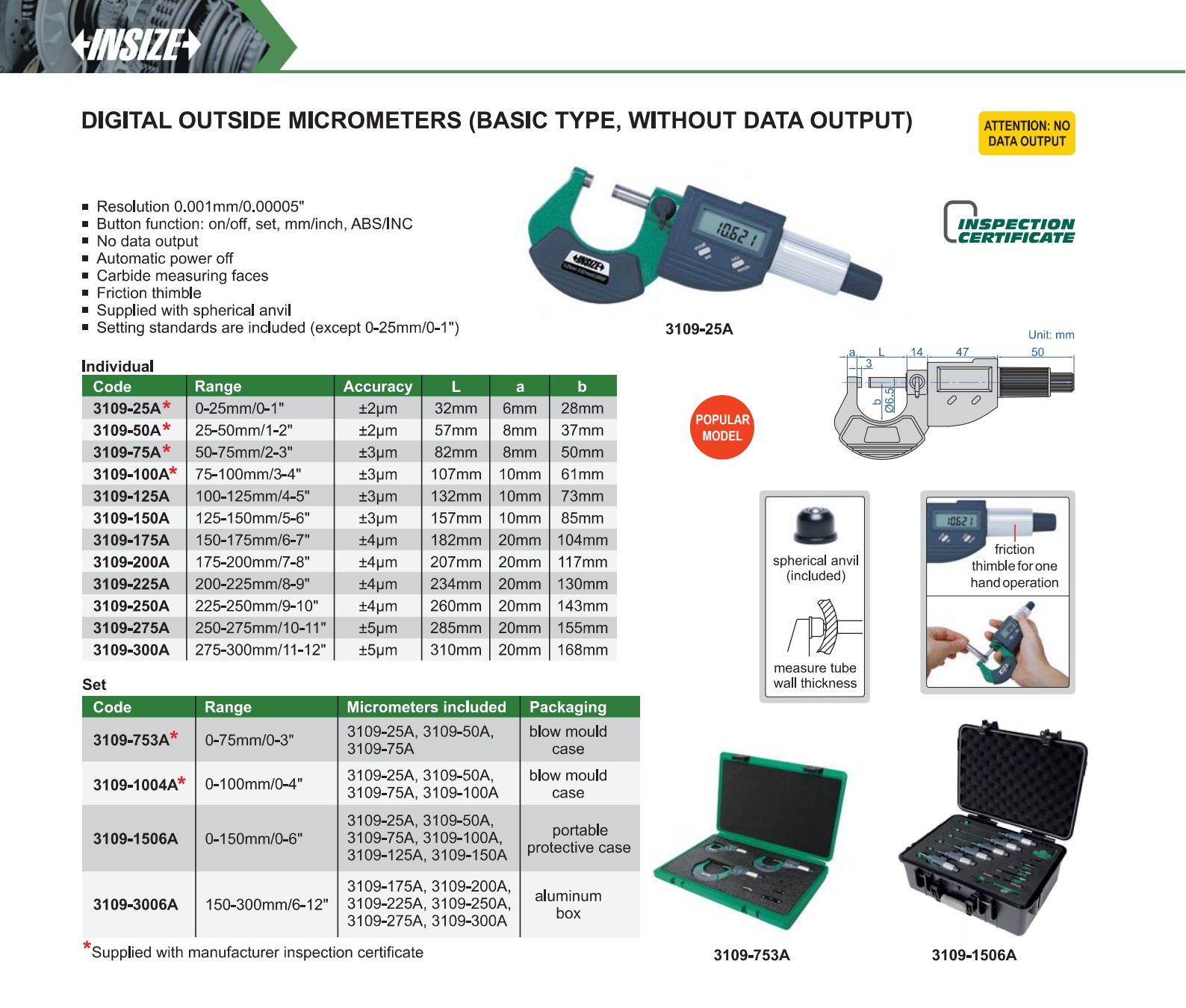 | 3109-753A (Set) | 0-75mm/0-3" | ±2~±3μm | 0.001mm/0.00005" |