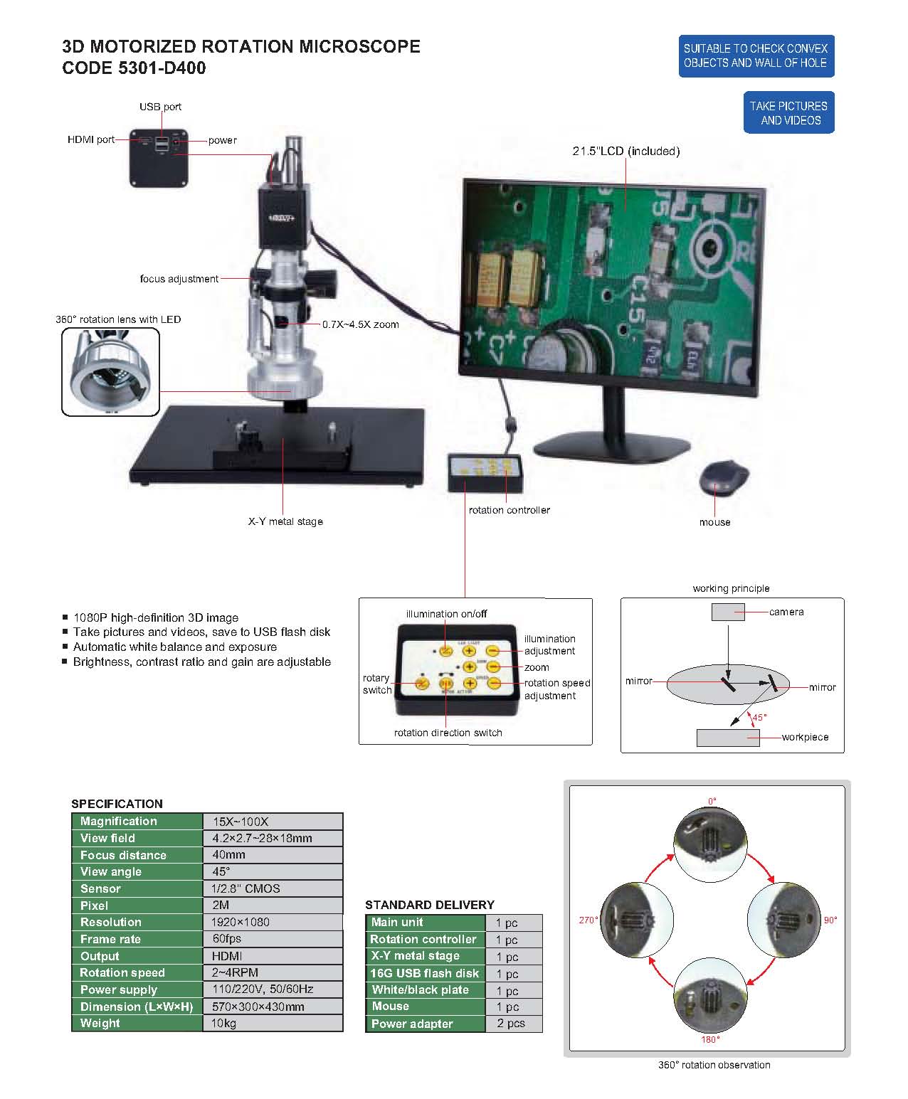 | 5301-D400 | 3D rotation microscopes | 15X~100X | 4.2×2.7mm~28×18mm | 2M |