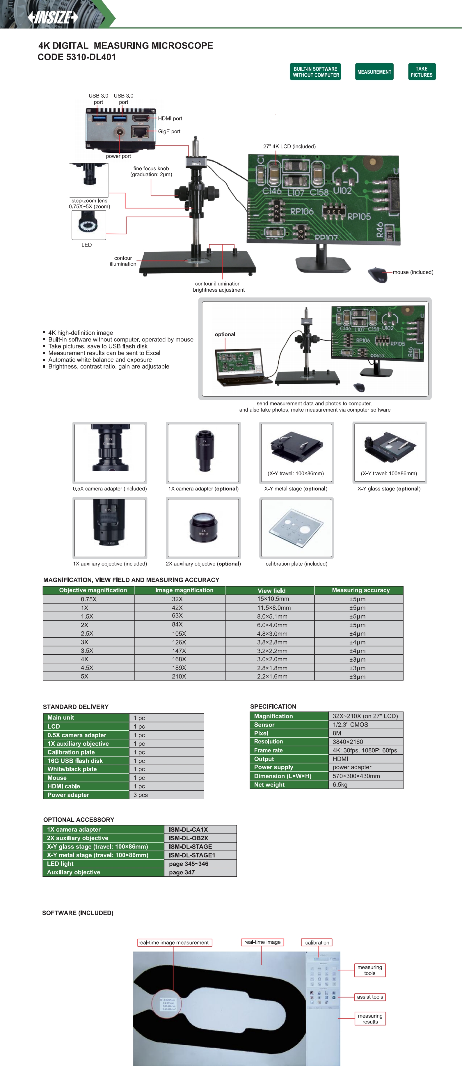 | 5310-DL401 | digital measuring microscopes | 32X~210X (on 27'' LCD) | 15×10.5mm, 11.5×8.0mm, 8.0×5.1mm, 6.0×4.0mm, 4.8×3.0mm, 3.8×2.8mm, 3.2×2.2mm, 3.0×2.0mm, 2.8×1.8mm, 2.2×1.6mm | 8M |