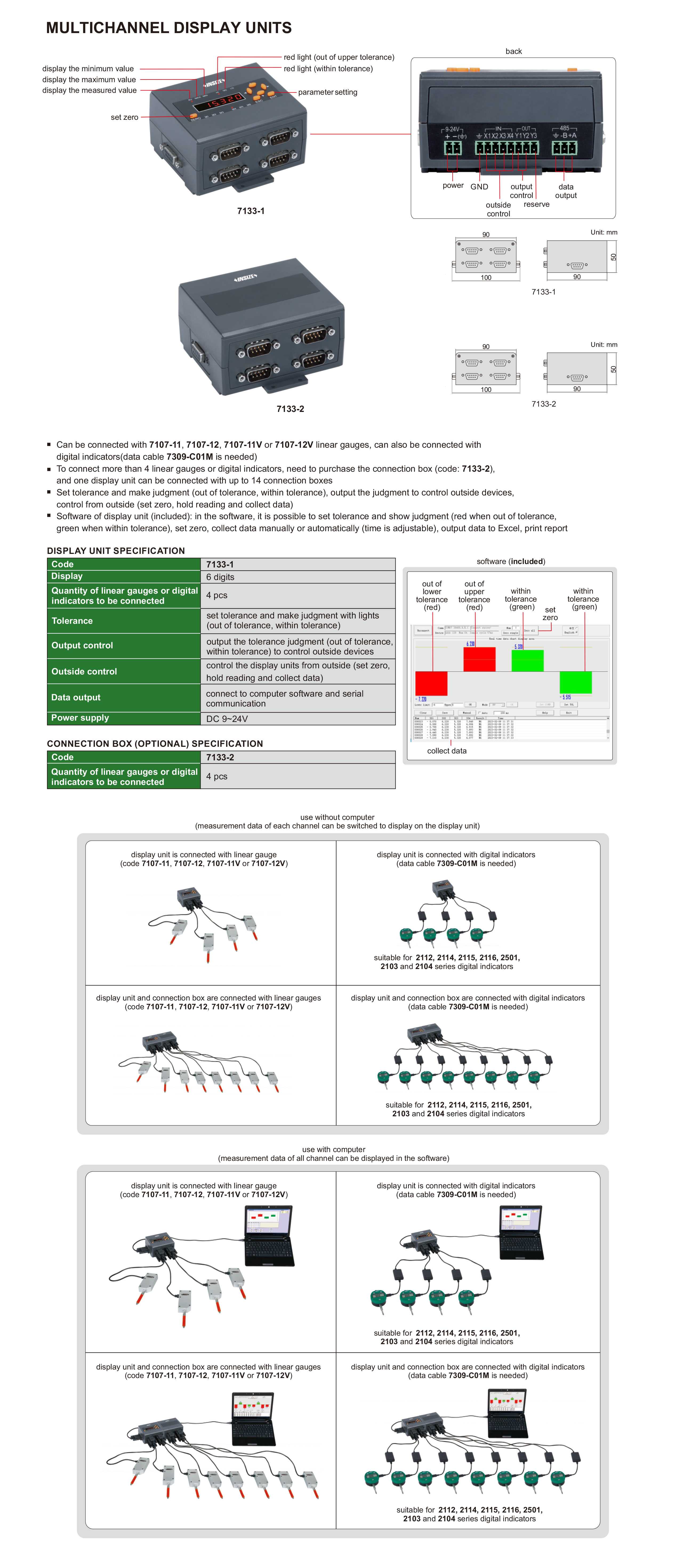 Can be connected with 7107-11, 7107-12, 7107-11V or 7107-12V linear gauges, can also be connected with digital indicators (data cable 7309-C01M is needed)