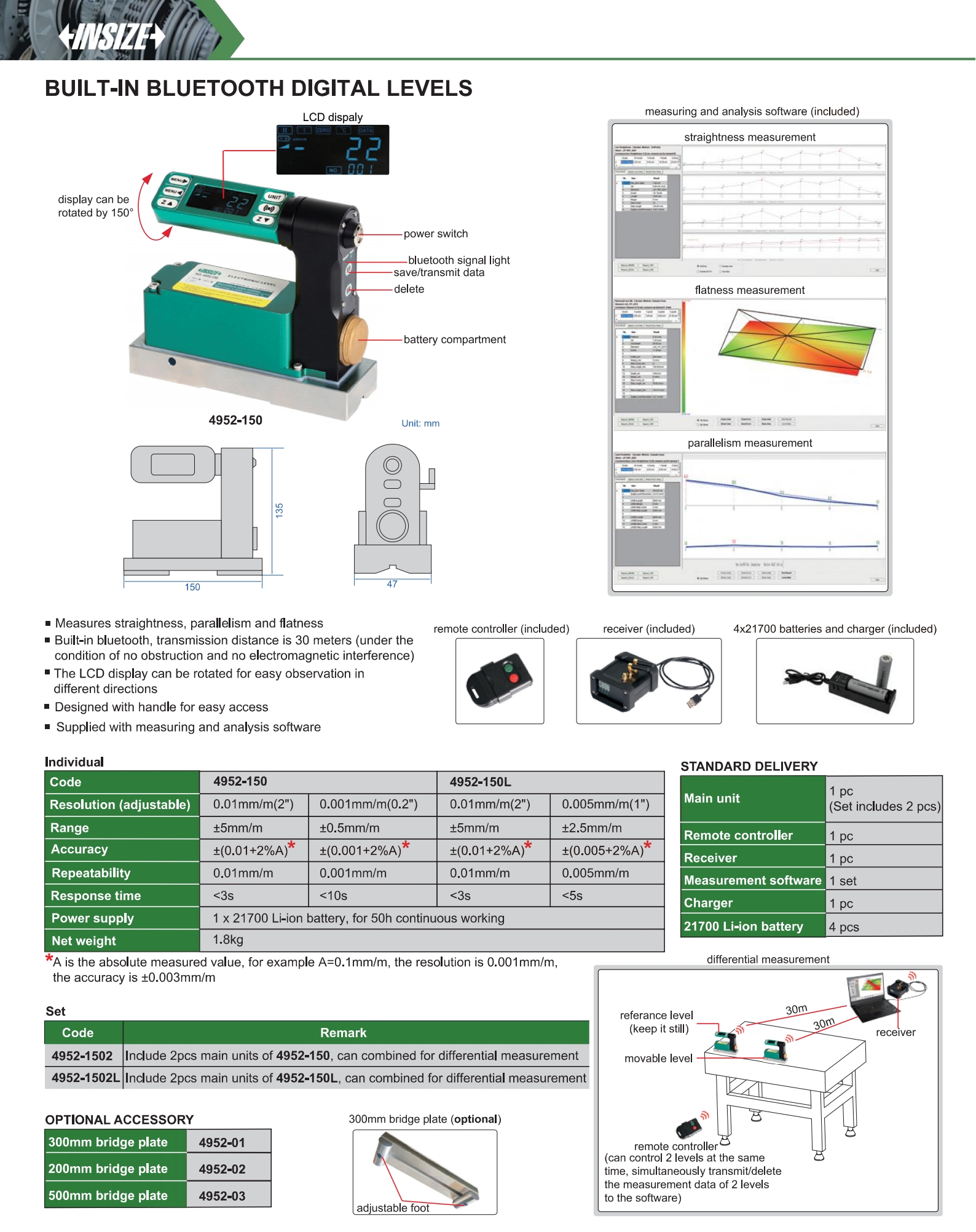 | 4952-150L | ±2.5mm/m | ±(0.005+2%A) | 0.005mm/m (1") | 0.005mm/m |
