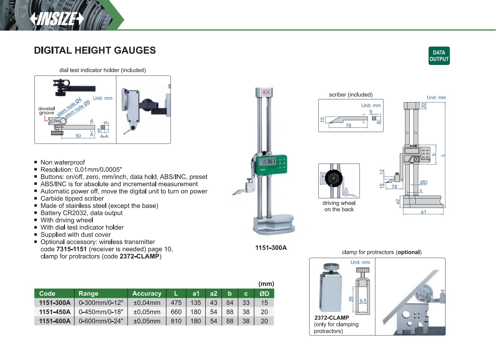| 1151-300A | 0-300mm/0-12" | ±0.04mm | 0.01mm/0.0005" |