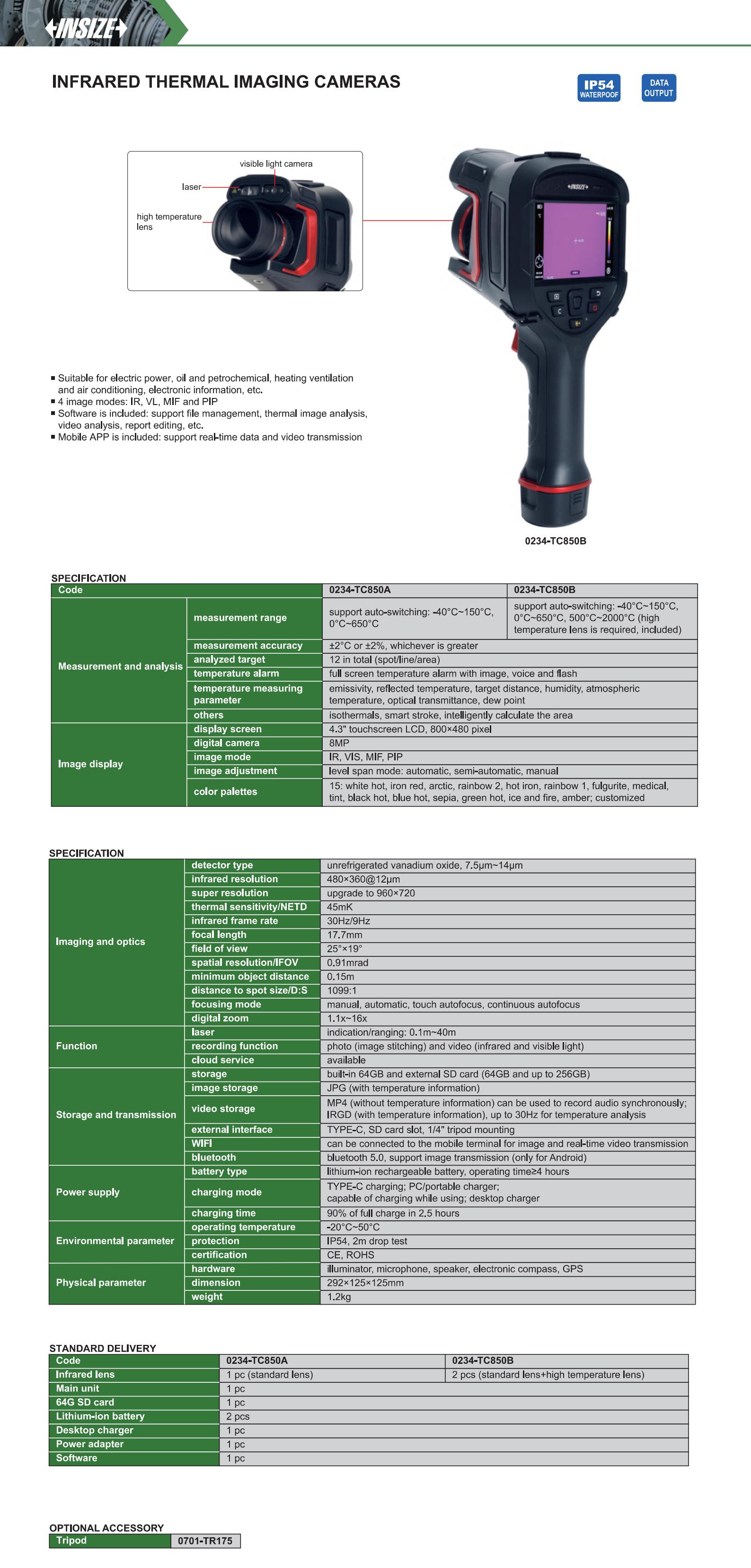 | 0234-TC850A | support auto-switching: -40°C~150°C, 0°C~650°C | 480×360@12µm | manual, automatic, touch autofocus, continuous autofocus | yes |