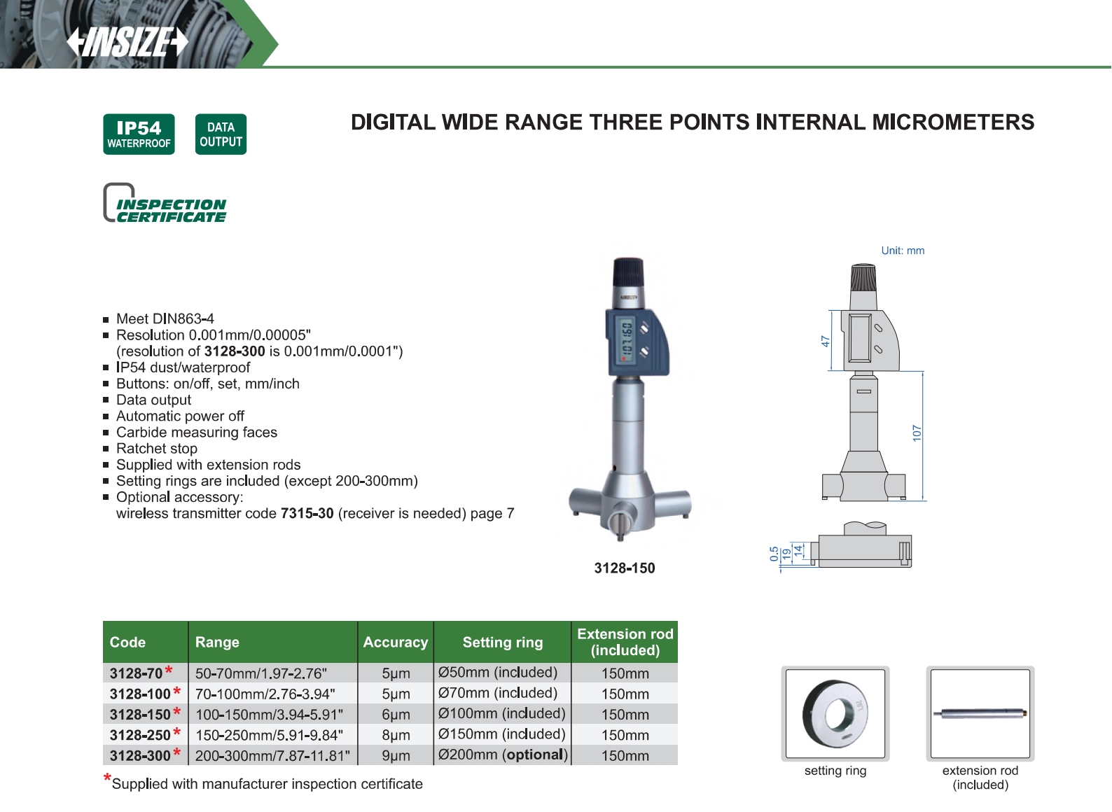 | 3128-250 | 150-250mm/5.91-9.84" | 8μm | 0.001mm/0.00005" |