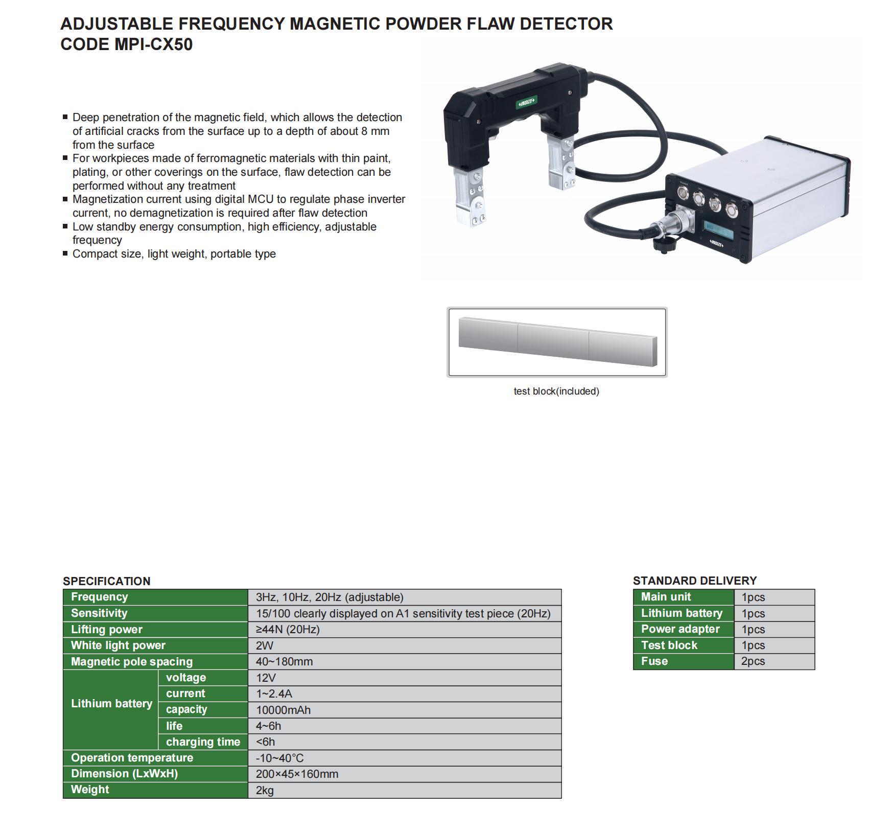 | MPI-CX50 | 15/100 clearly displayed on A1 sensitivity test piece (20Hz) | ≥44N (20Hz) | 40~180mm |