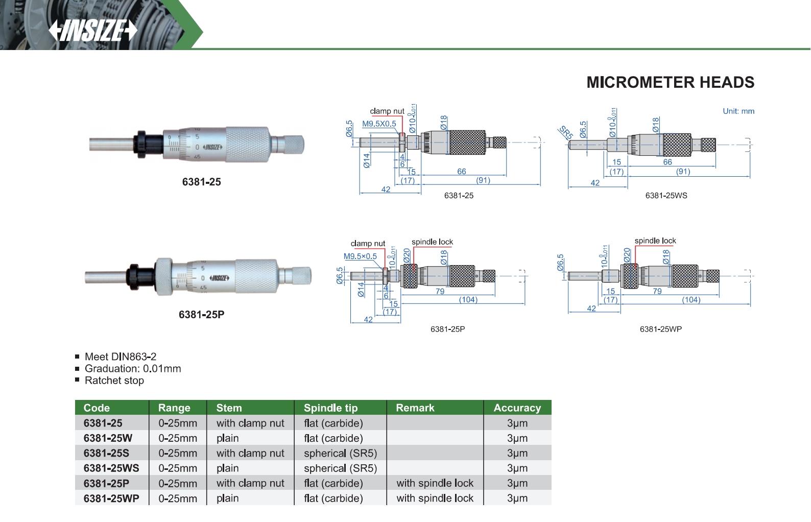 | 6381-25P | 0-25mm | 3μm | 0.01mm | with clamp nut | flat (carbide) | with spindle lock |