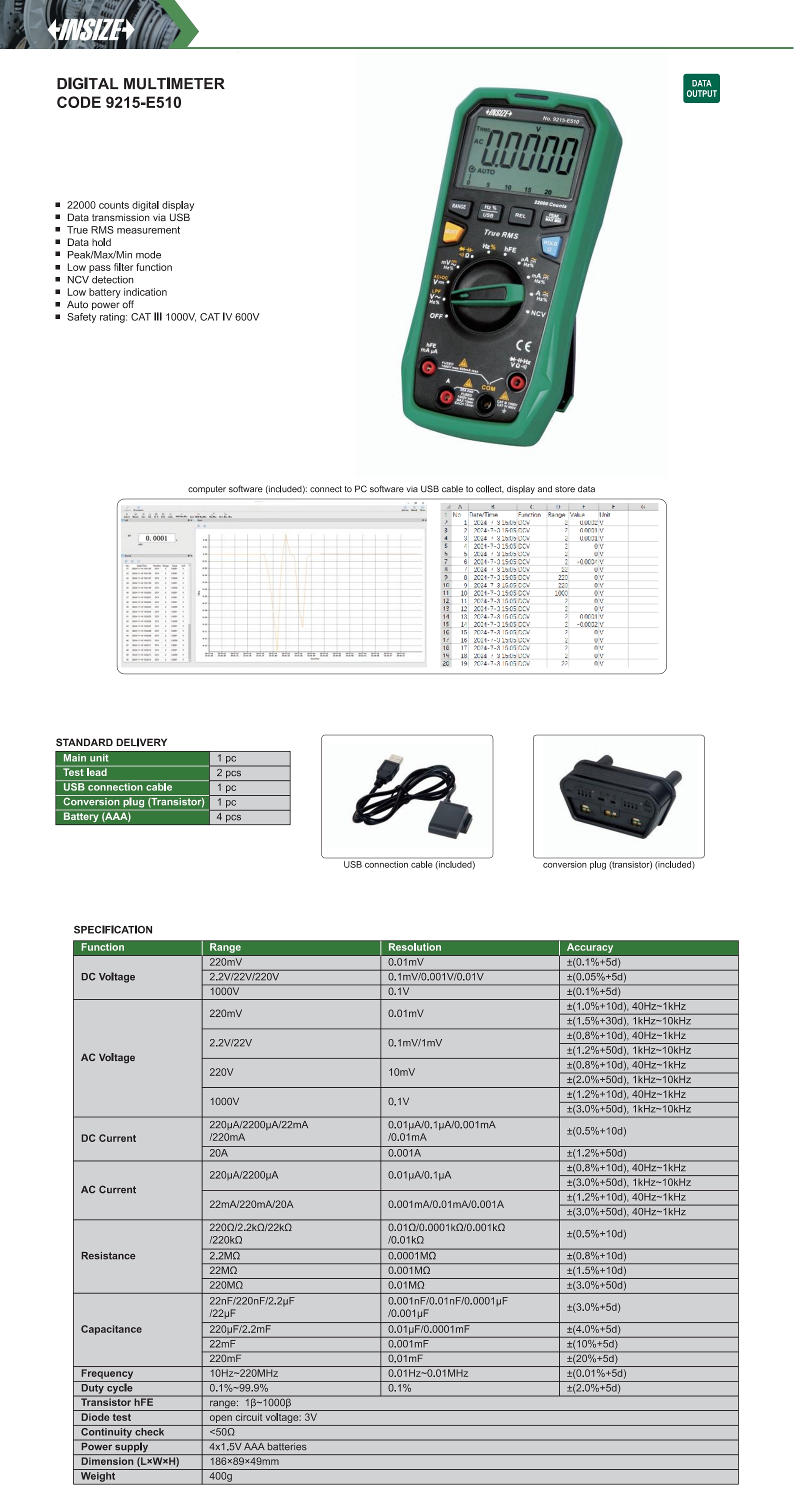 | 9215-E510 | 4 ½ | 20A | 20A | 1000V | 1000V | ±(0.05%+5d) | no | yes | USB |