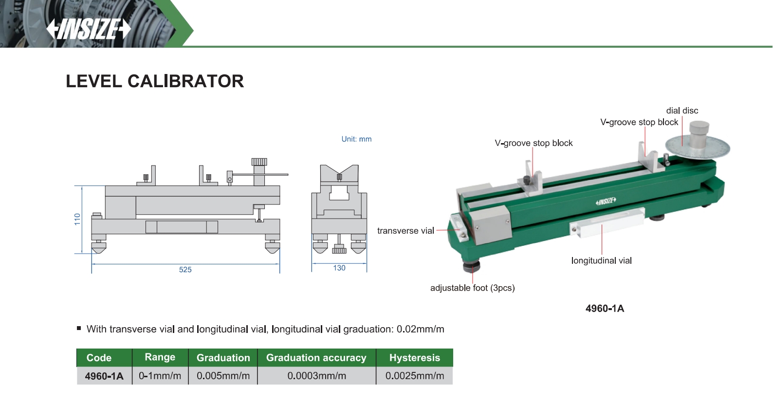 | 4960-1A | 0-1mm/m | Graduation accuracy:0.0003mm/m | 0.005mm/m | 0.0025mm/m |
