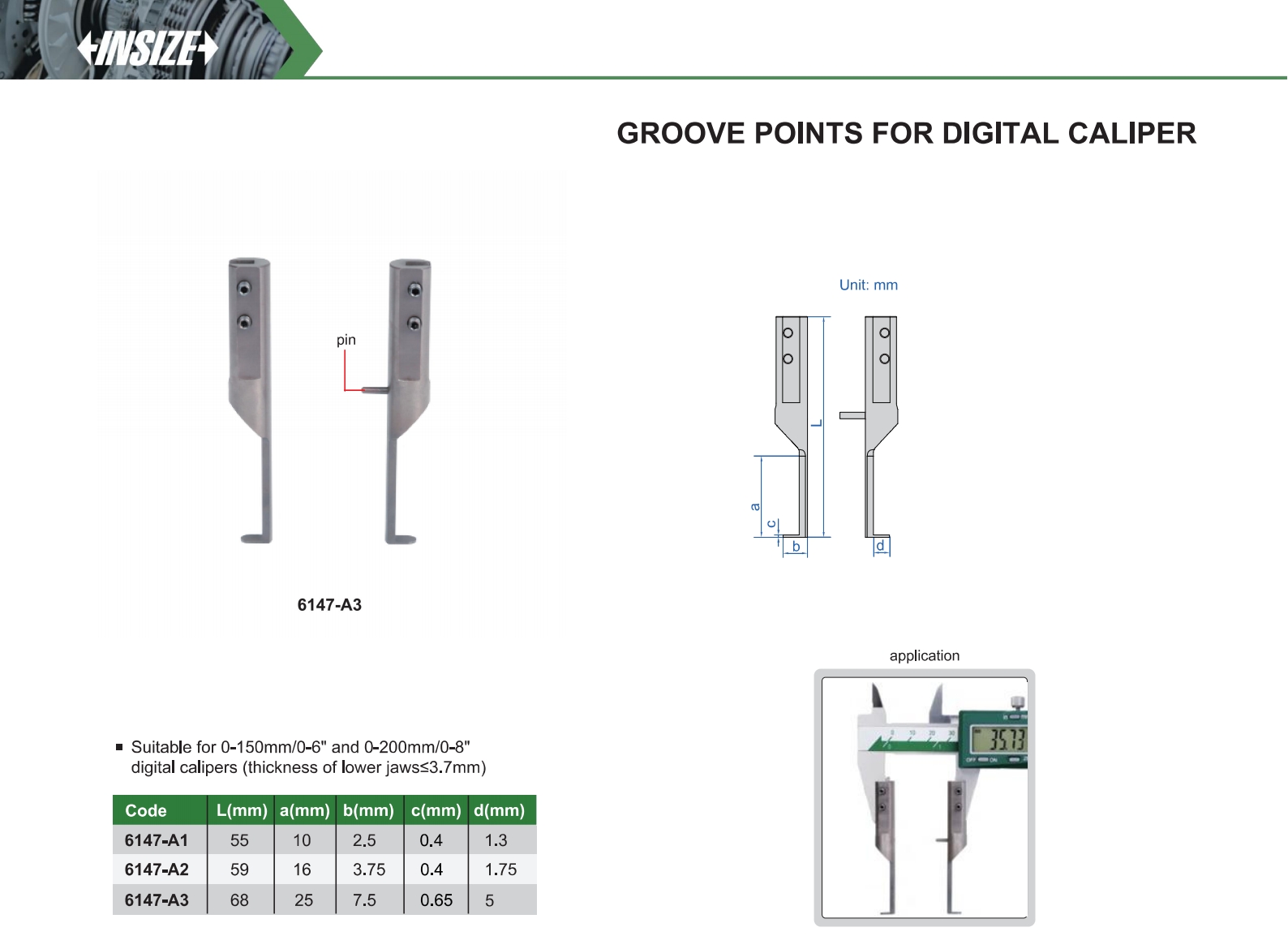 | 6147-A3 | suitable for 0-150mm/0-6" and 0-200mm/0-8" digital calipers (thickness of lower jaws≤3.7mm) |