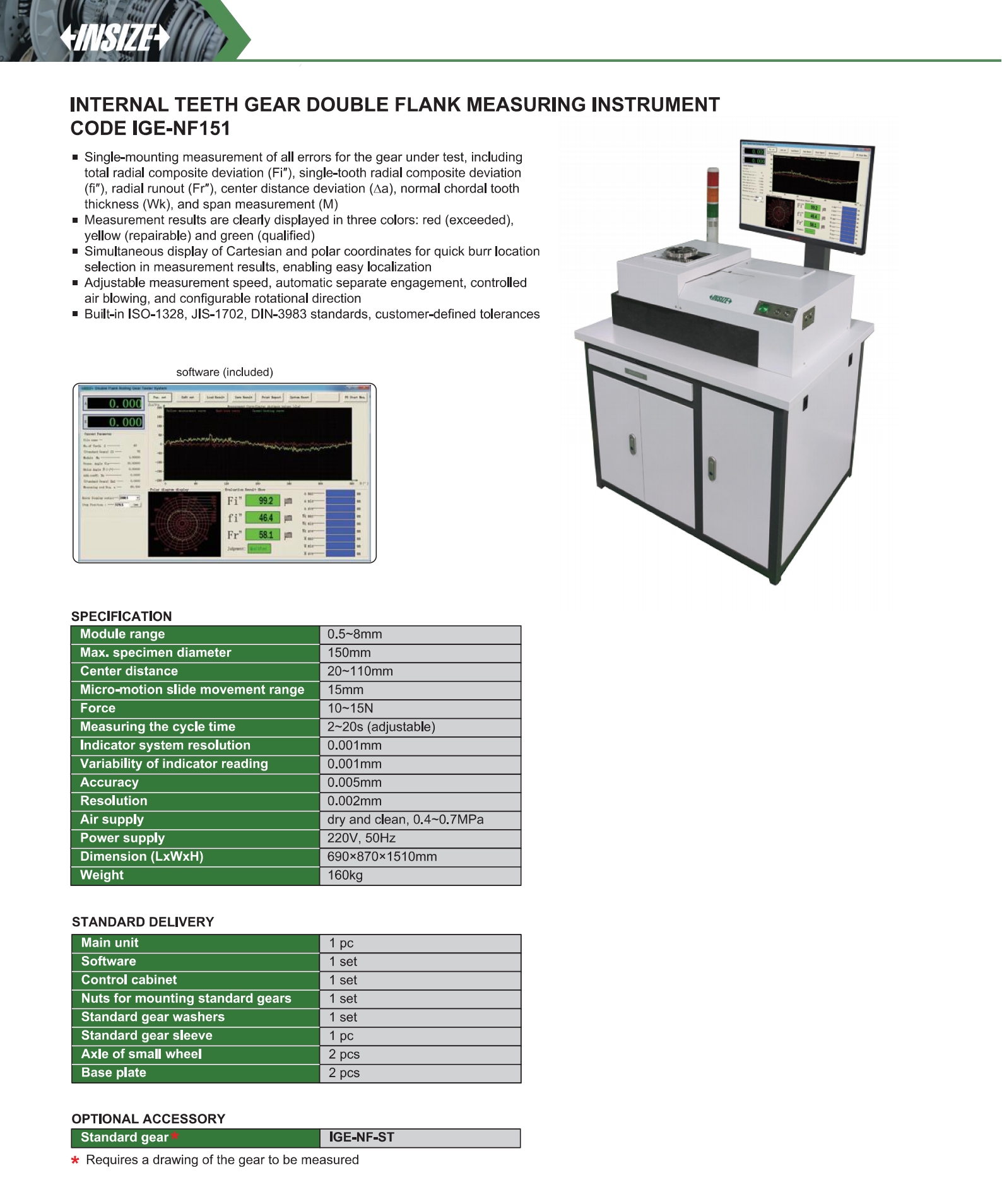 Single-mounting measurement of all errors for the gear under test, including total radial composite deviation (Fi″), single-tooth radial composite deviation (fi″), radial runout (Fr″), center distance deviation (∆a), normal chordal tooth thickness (Wk), and span measurement (M)