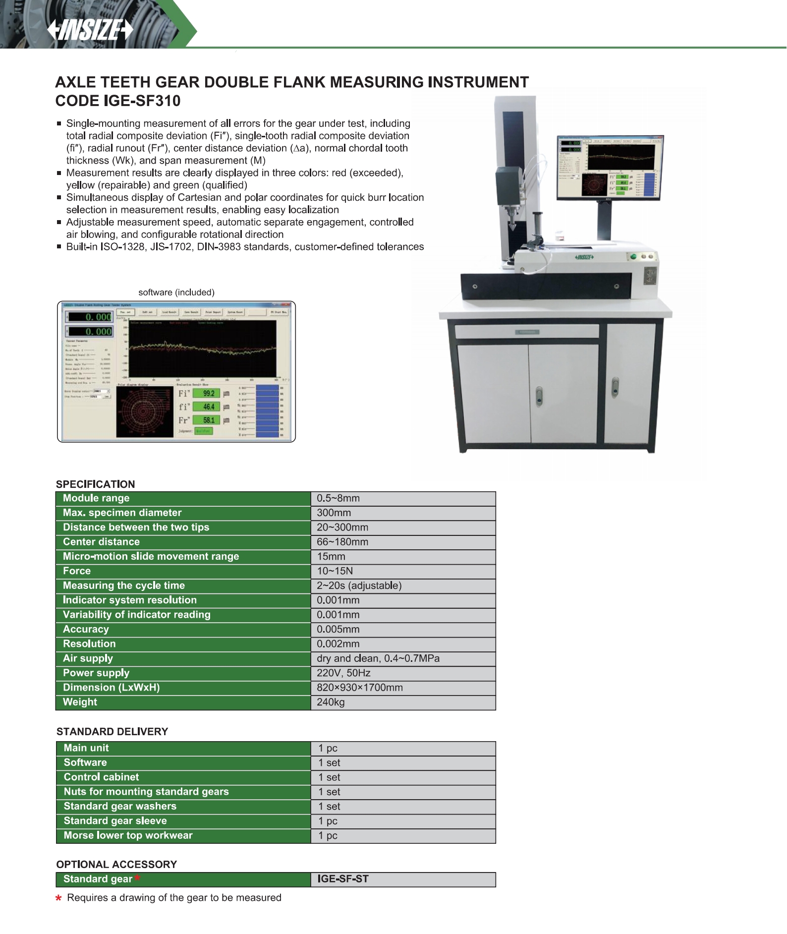 Single-mounting measurement of all errors for the gear under test, including total radial composite deviation (Fi″), single-tooth radial composite deviation (fi″), radial runout (Fr″), center distance deviation (∆a), normal chordal tooth thickness (Wk), and span measurement (M)