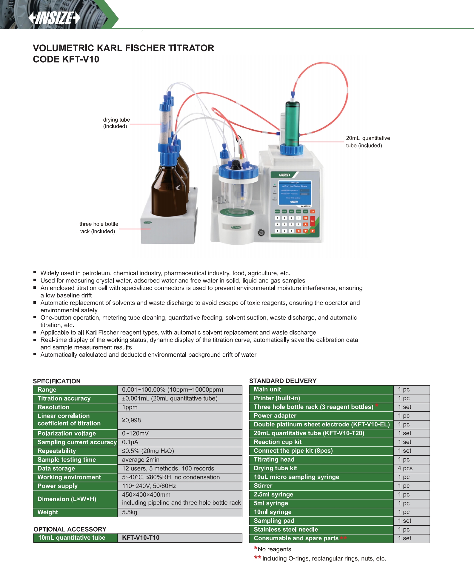 | KFT-V10 | 0.001~100.00% (10ppm~10000ppm) | Titration accuracy: ±0.001mL (20mL quantitative tube) | 1ppm |
