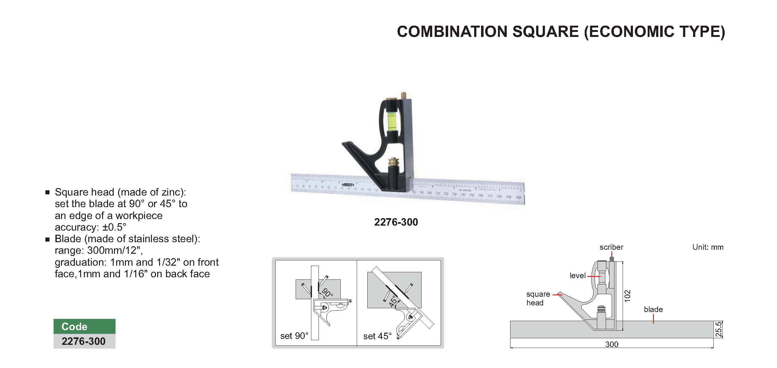 Square head (made of zinc): set the blade at 90° or 45° to an edge of a workpieceaccuracy: ±0.5°