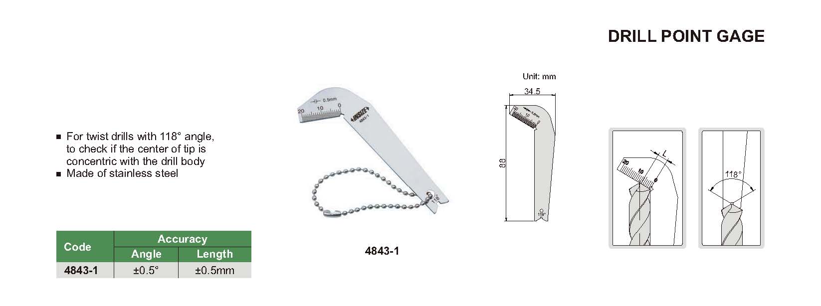For twist drills with 118° angle, to check if the center of tip is concentric with the drill body