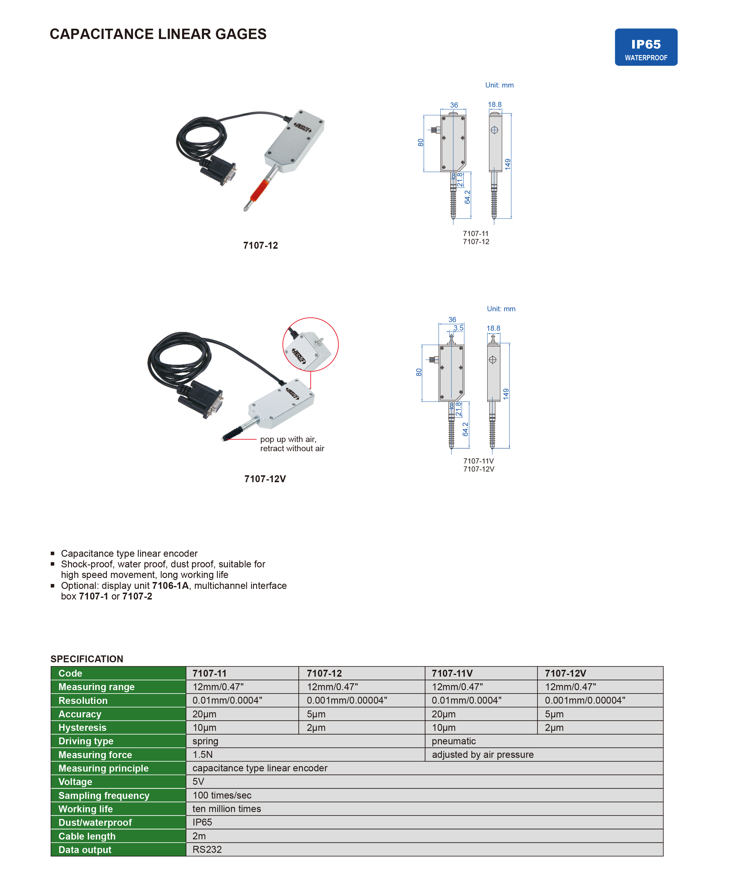 | 7107-12 | Capacitance | 12mm/0.47" | 5µm | spring |