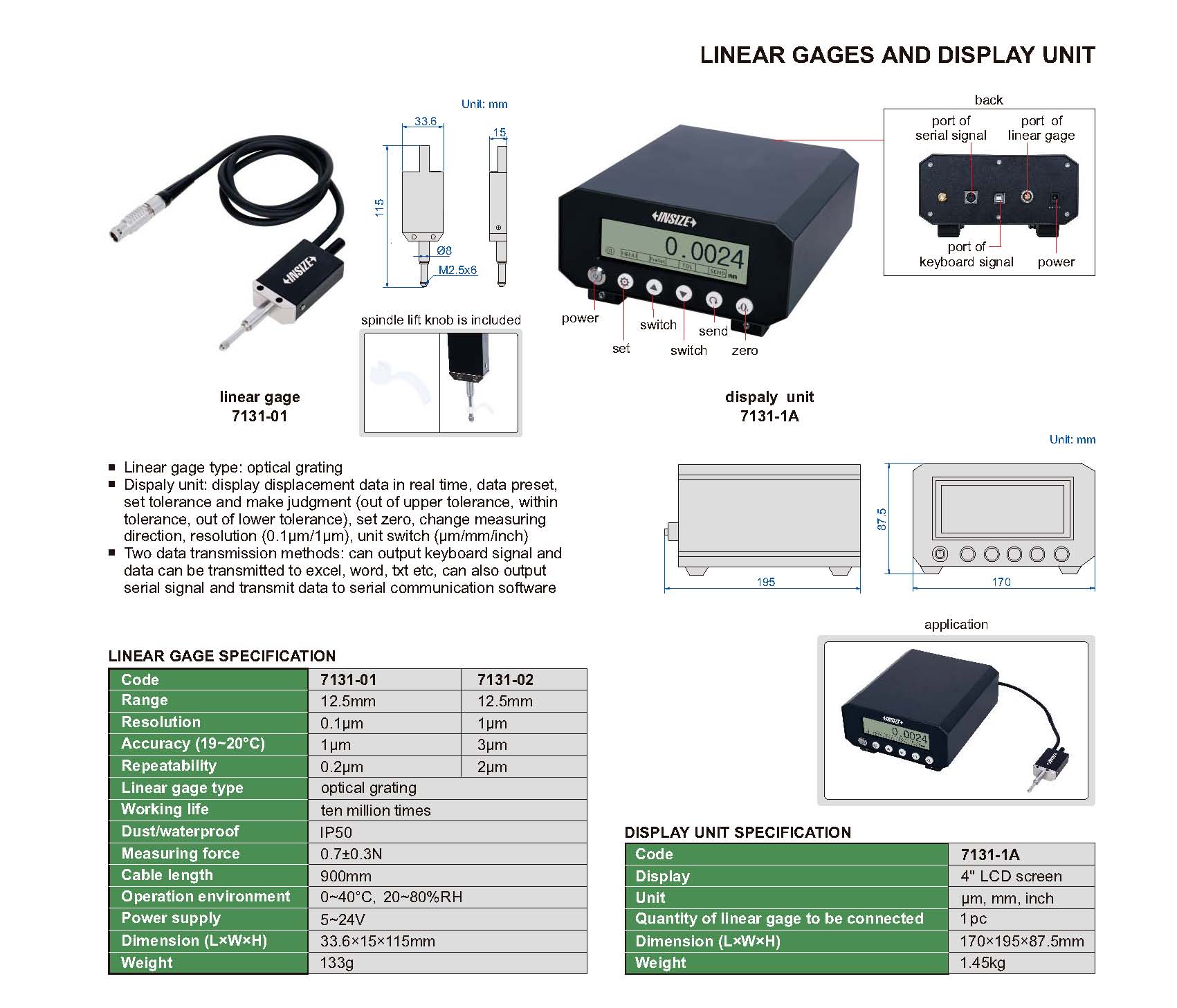 Dispaly unit: display displacement data in real time, data preset, set tolerance and make judgment (out of upper tolerance, within tolerance, out of lower tolerance), set zero, change measuring direction, resolution (0.1μm/1μm), unit switch (µm/mm/inch)