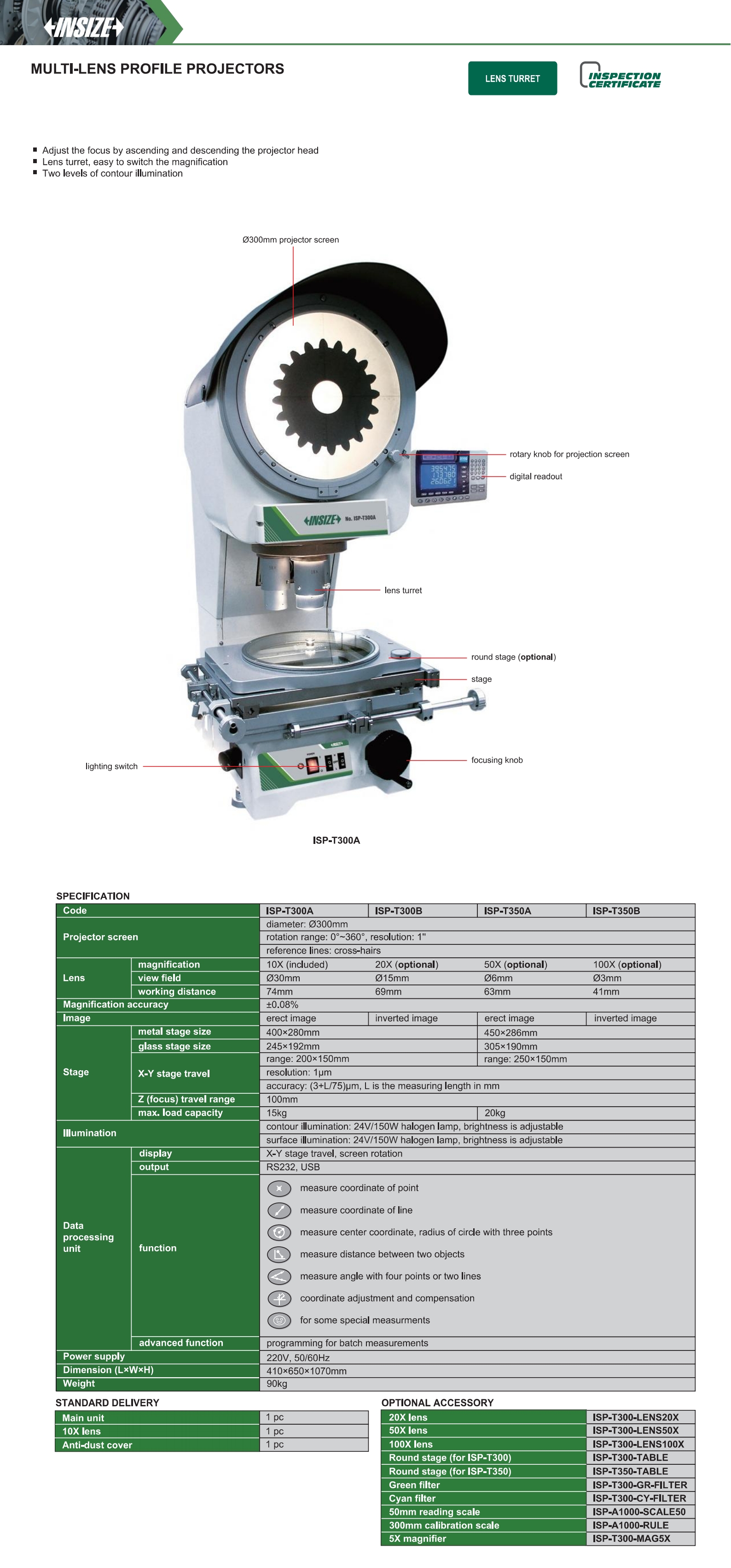 | ISP-T300A | vertical | 200×150mm | (3+L/75)µm | 1µm | not included | Ø300mm | erect image |