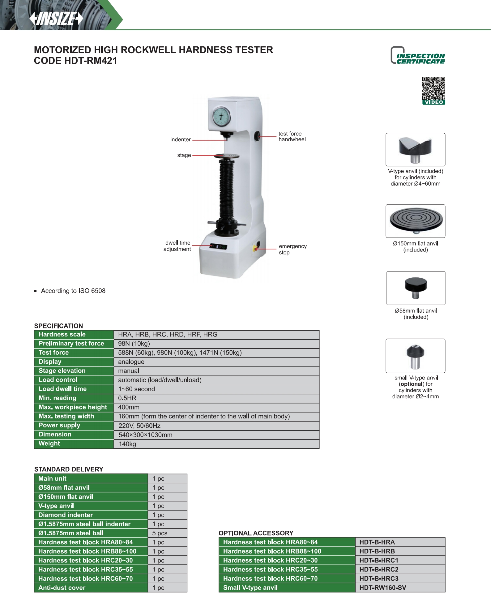 | Code | Resolution | Load control | Max. workpiece height | Max. testing width | Hardness scale |