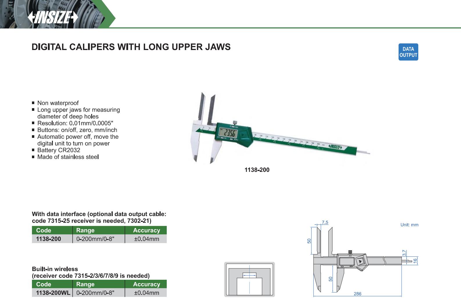 | 1138-200WL | 0-200mm/0-8" | ±0.04mm | 0.01mm/0.0005" | built-in wireless |