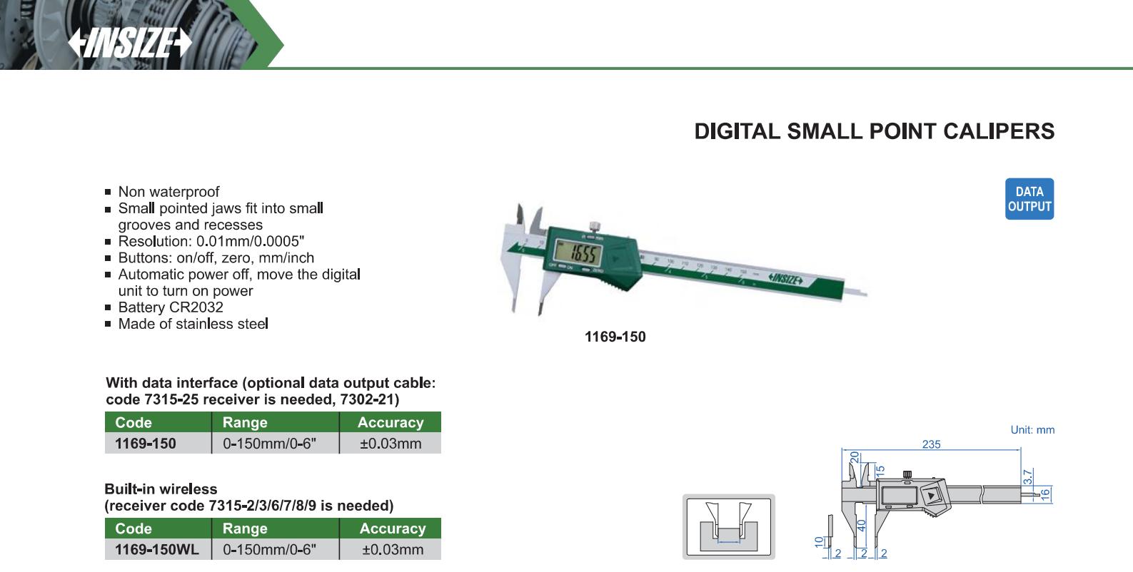 | 1169-150WL | 0-150mm/0-6" | ±0.03mm | 0.01mm/0.0005" | built-in wireless |