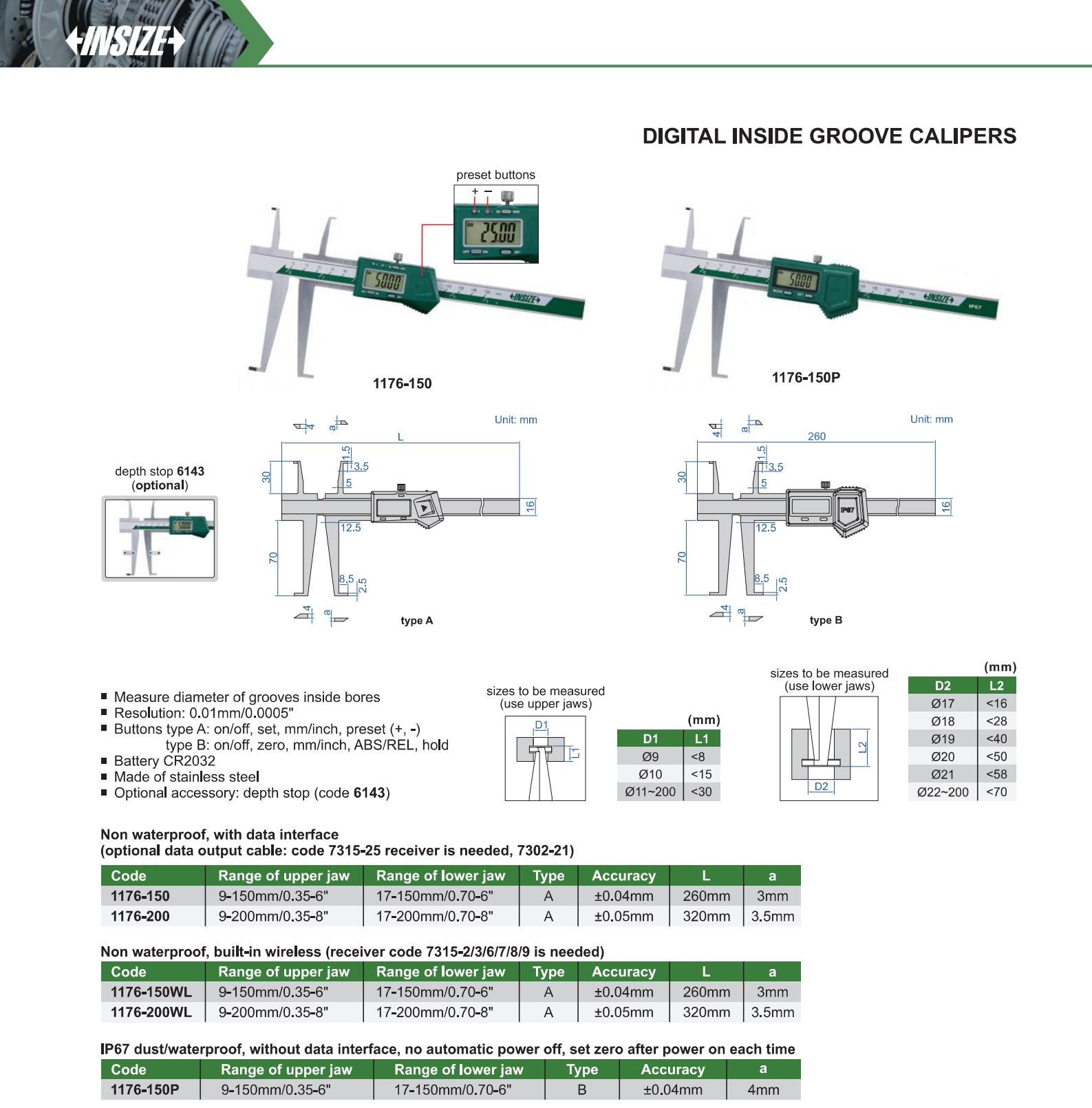 | 1176-150 | A | 9-150mm/0.35-6" | 17-150mm/0.70-6" | ±0.04mm | 0.01mm/0.0005" | with data interface |