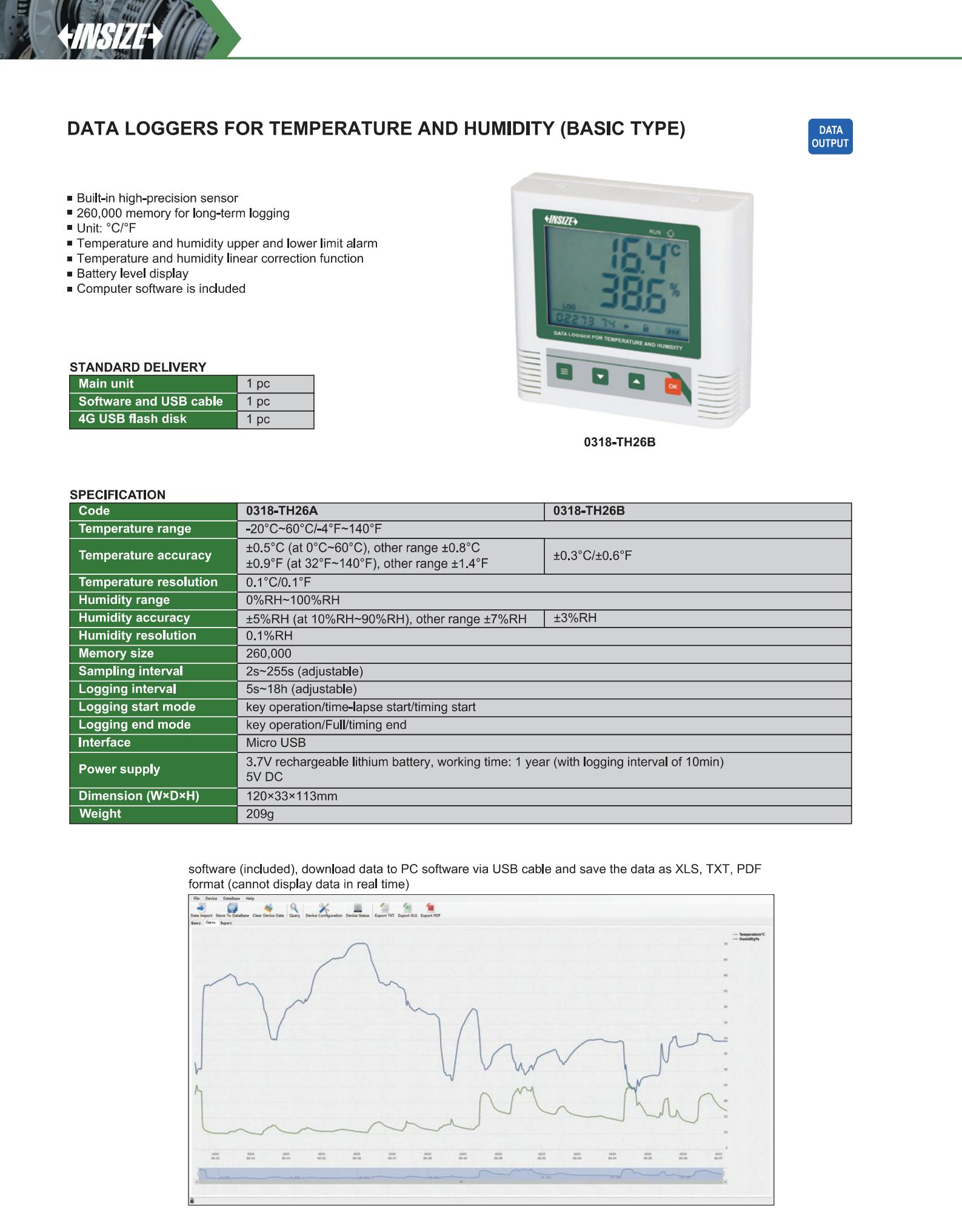 | 0318-TH26B | Digital | Internal | ±0.3°C/±0.6°F | 0%RH~100%RH | ±3%RH | yes | yes | yes | -20°C~60°C/-4°F~140°F |