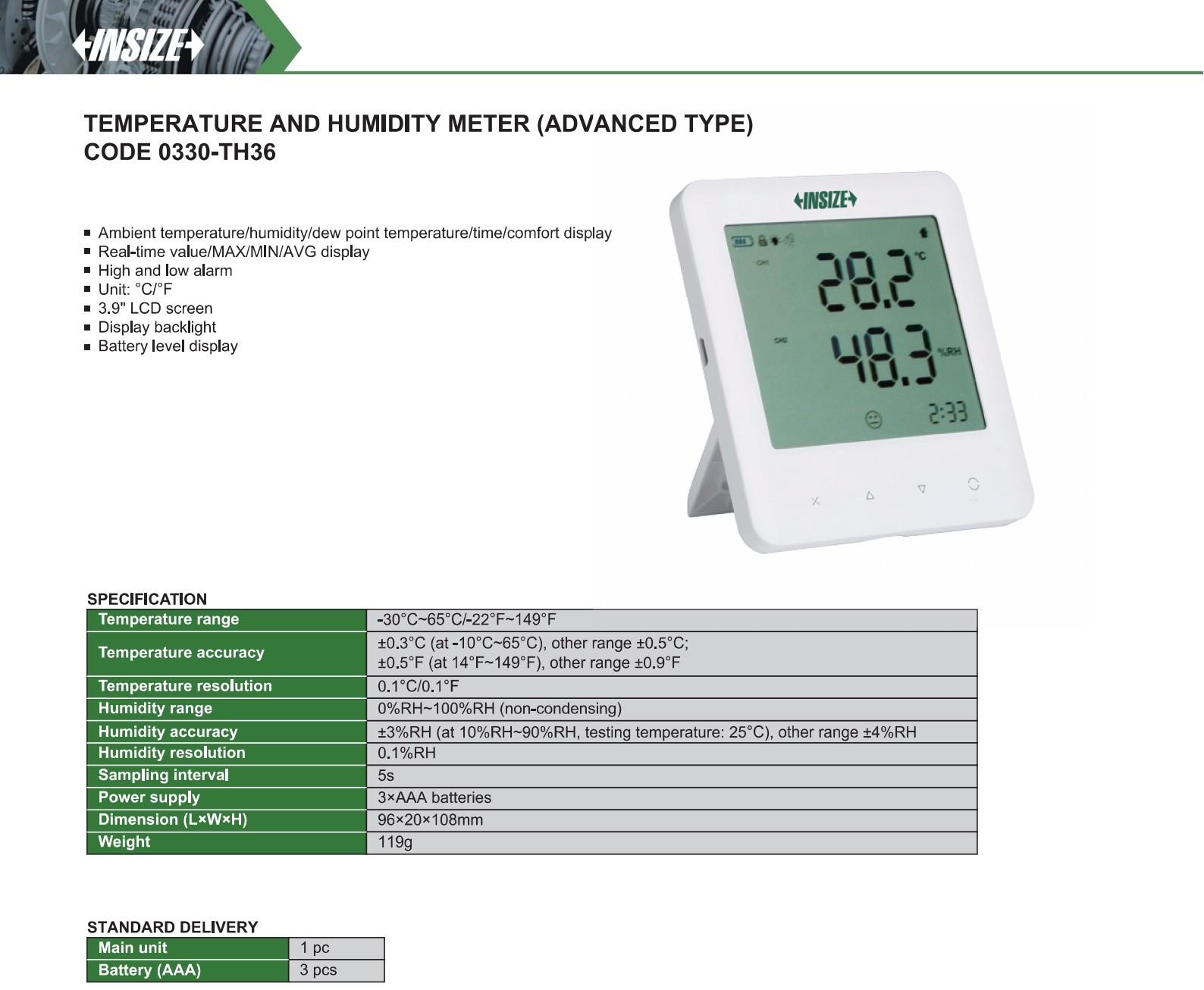 | 0330-TH36 | Digital | Internal | ±0.3°C(at -10°C~65°C), other range ±0.5°C; ±0.5°F(at 14°F~149°F), other range ±0.9°F | 0%RH~100%RH (non-condensing) | ±3%RH (at 10%RH~90%RH, testing temperature: 25°C), other range ±4%RH | yes | -30°C~65°C/-22°F~149°F |