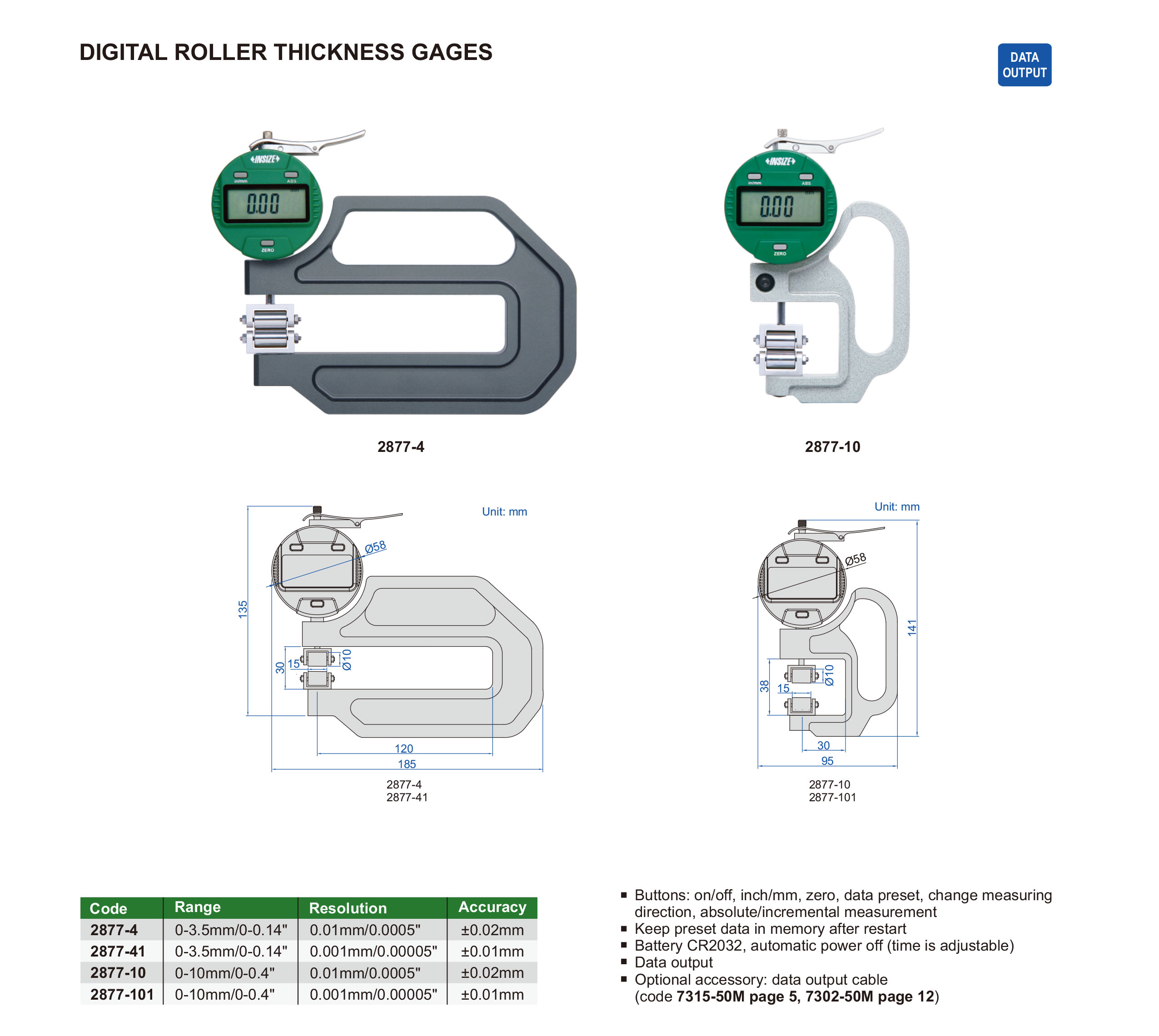 | 2877-101 | 0-10mm/0-0.4" | ±0.01mm | 0.001mm/0.00005" |
