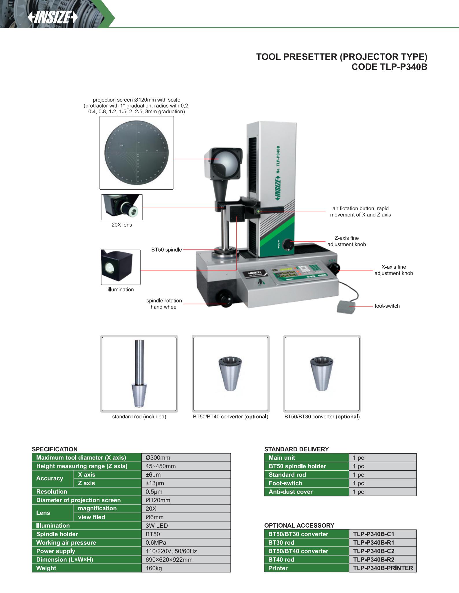 | TLP-P340B | 0.5μm | Ø300mm | 45~450mm | ±6μm | ±13μm |