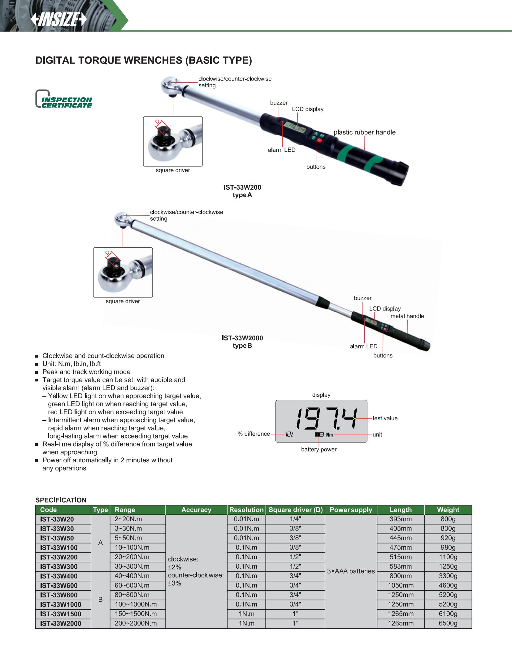 | IST-33W200 | Digital | 20~200N.m | No transmission | Digital display | Fixed ratchet head |