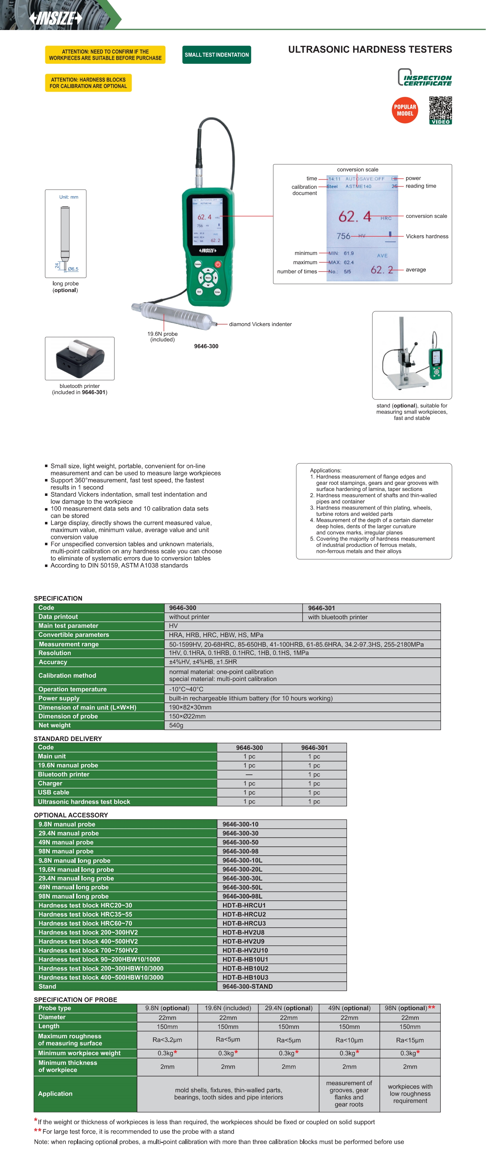 | 9646-301 | 50-1599HV, 20-68HRC, 85-650HB, 41-100HRB, 61-85.6HRA, 34.2-97.3HS, 255-2181MPa | HRA, HRB, HRC, HBW, HS, Mpa | with bluetooth printer |