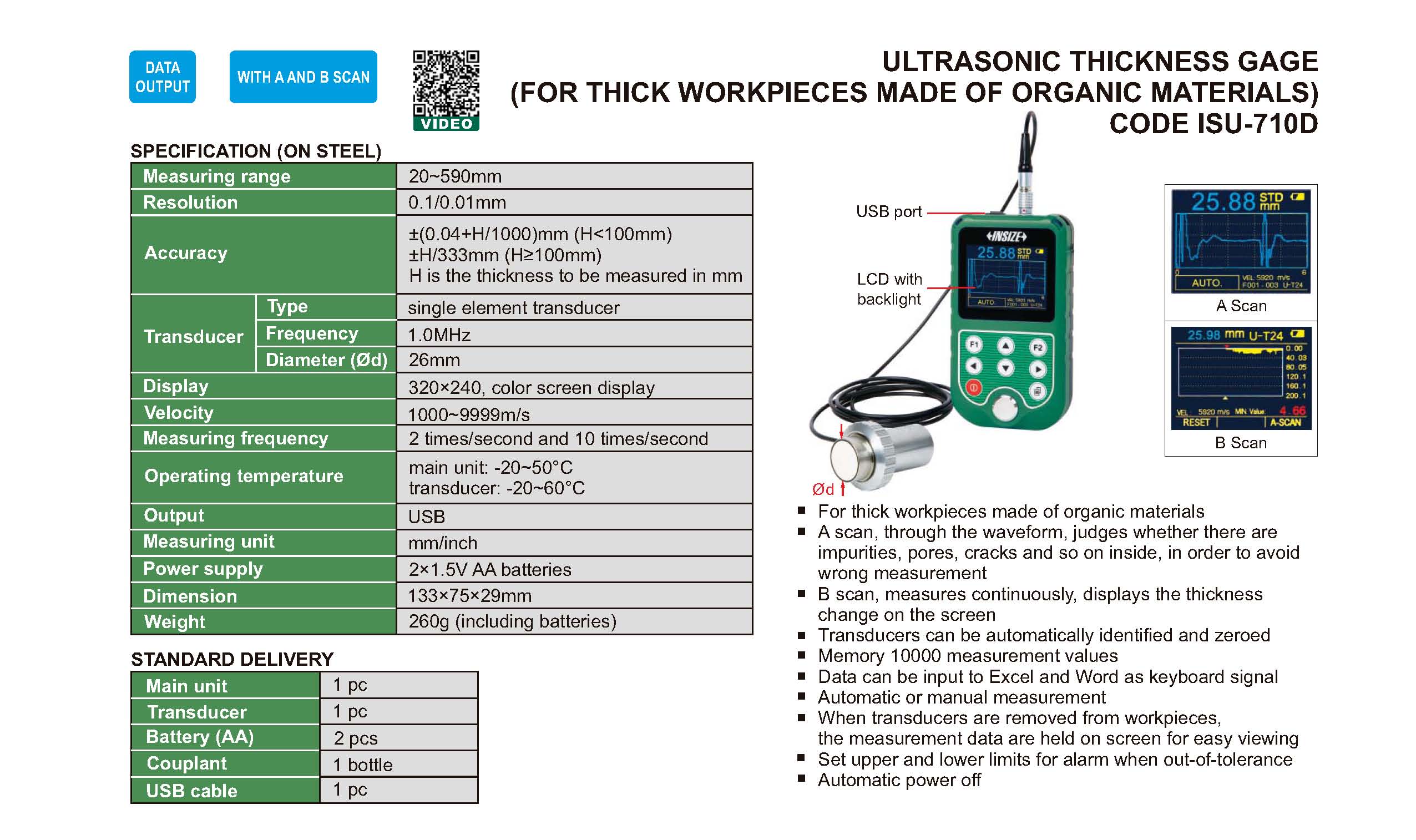 | ISU-710D | 20~590mm | ±(0.04+H/1000)mm (H<100mm), ±H/333mm (H≥100mm) | 1.0MHz | USB | 1000~9999m/s | 26mm |