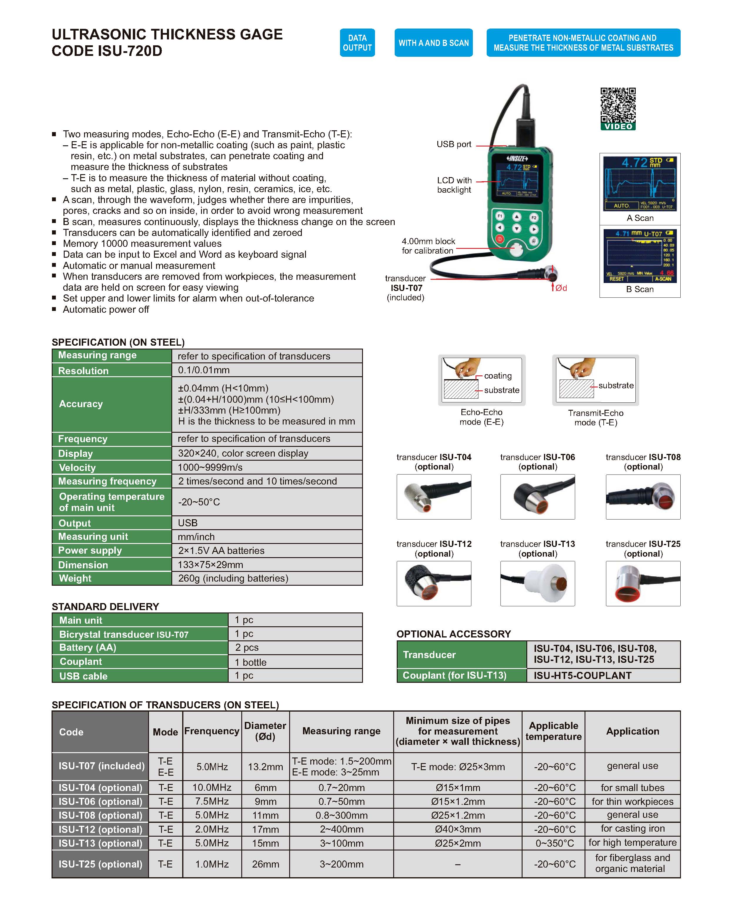 | ISU-720D | T-E mode: 1.5~200mm, E-E mode: 3~25mm | ±0.04mm (H<10mm), ±(0.04+H/1000)mm (10≤H<100mm), ±H/333mm (H≥100mm) | 5.0MHz | USB | 1000~9999m/s | 13.2mm |