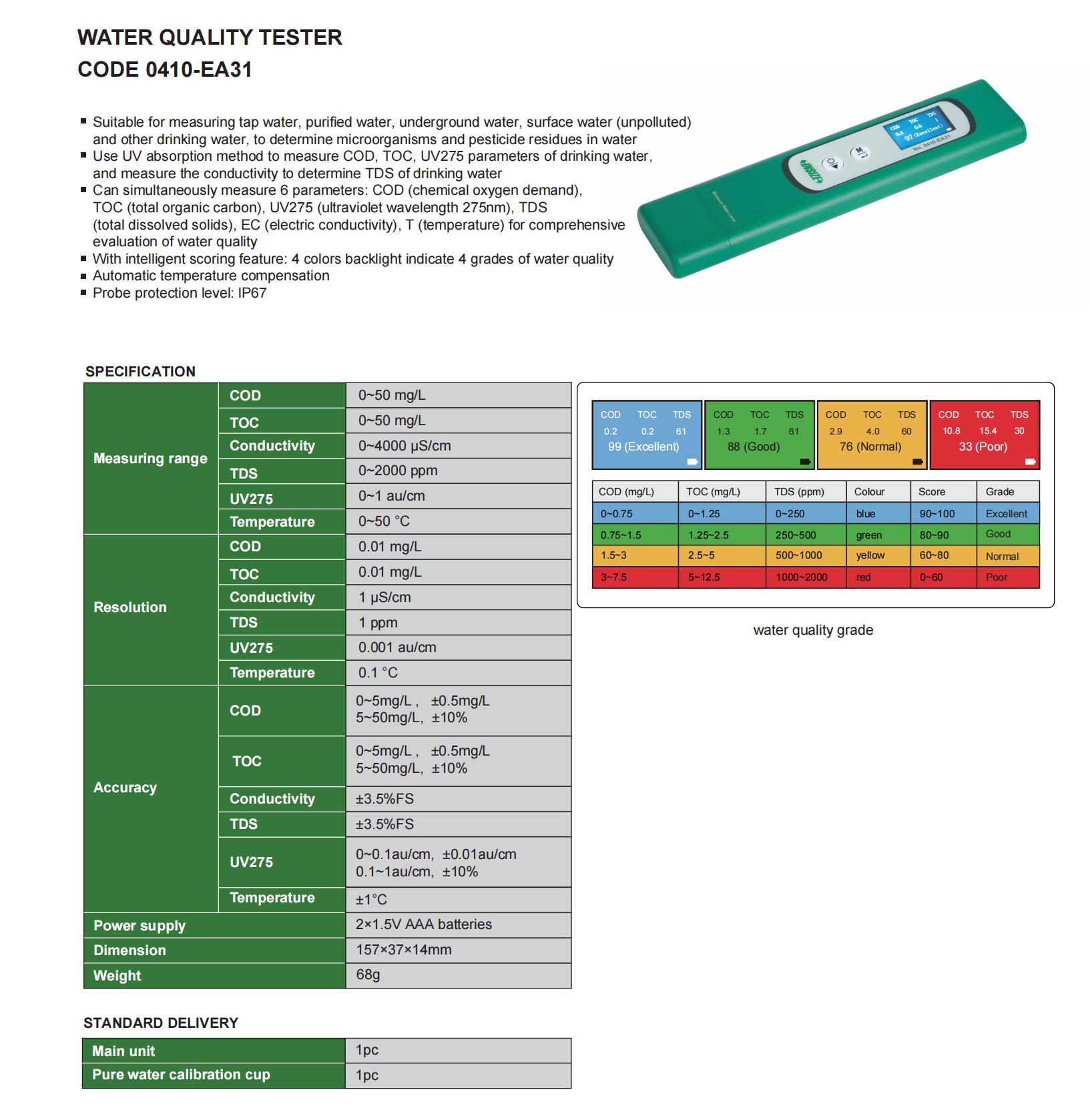 | 0410-EA31 | Conductivity/TDS | Off-line | 0~50mg/L, 0~4000μS/cm, 0~2000ppm, 0~1au/cm, 0-50°C | no |